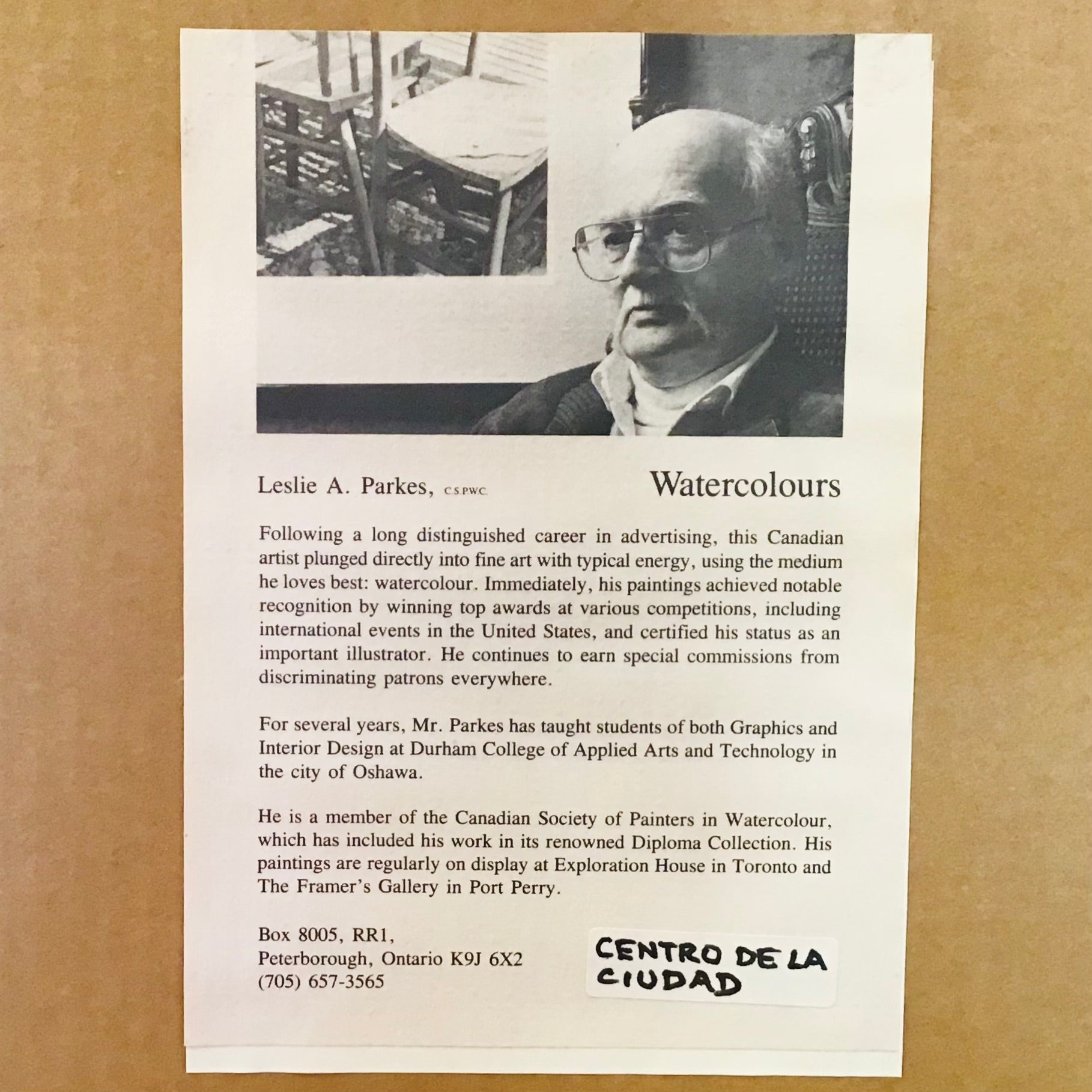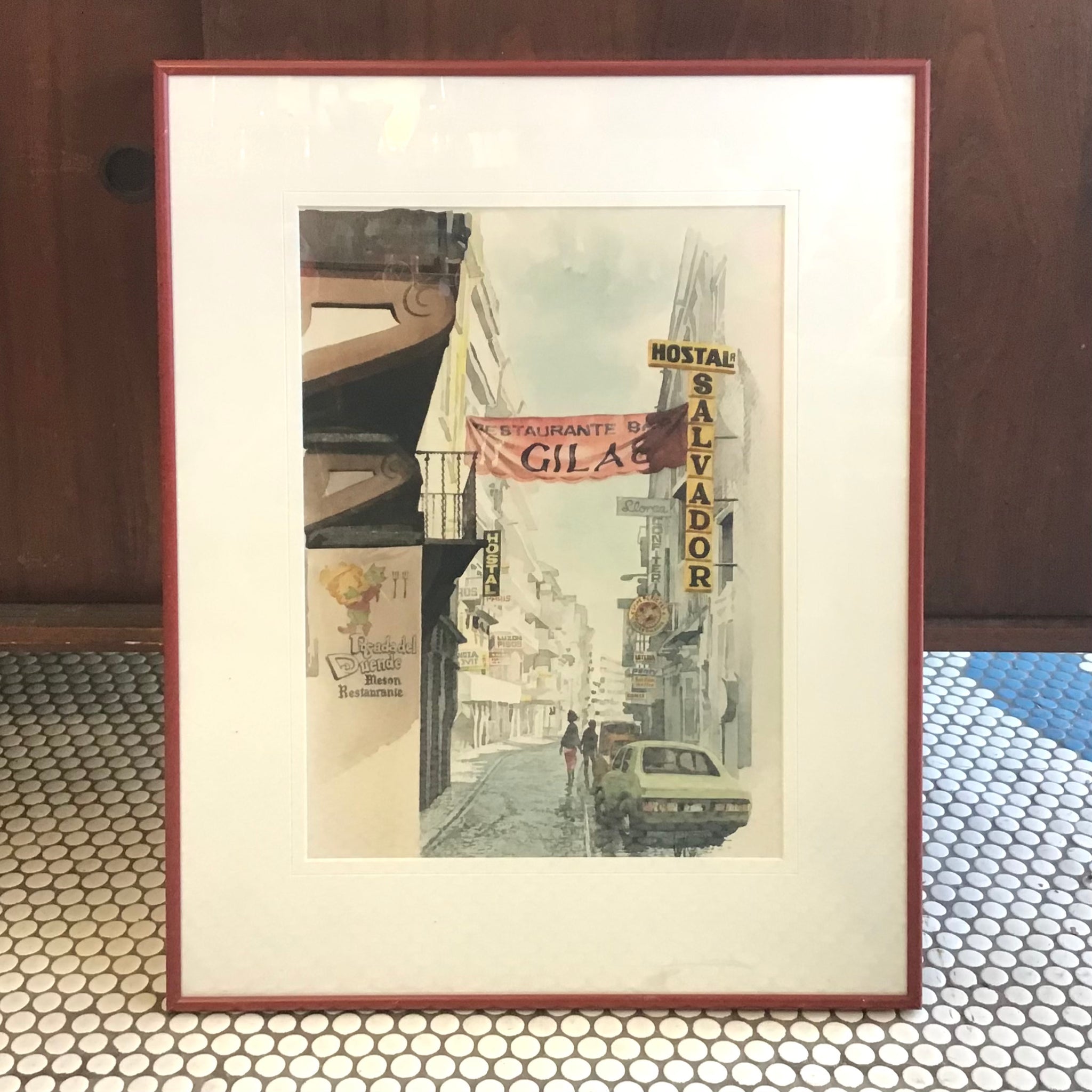 Watercolour painting, titled “Centro De La Ciudad” by Canadian artist, Leslie A. Parkes. Parkes is a member of the Canadian Society of Painters in Watercolour. Original frame.