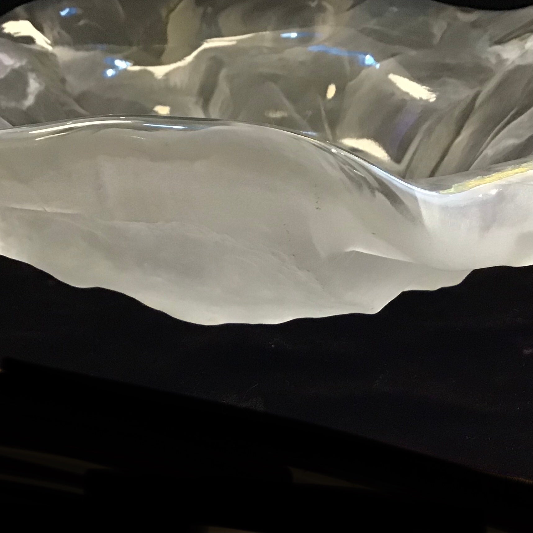 Vintage 1980s art glass bowl, designed by Dutch artist and sculptor Jolanda Prinsen for the German glass factory Walther Glass. The bowl has a unique design with a smooth, glossy interior and a more organic textured frosted exterior with textured bottom surface with rock and shell structures inspired by nature, particularly elements like seaweed and cockles. Very Scandinavian!