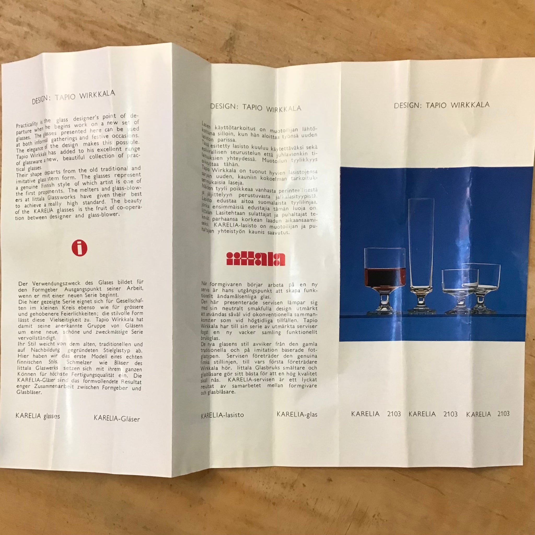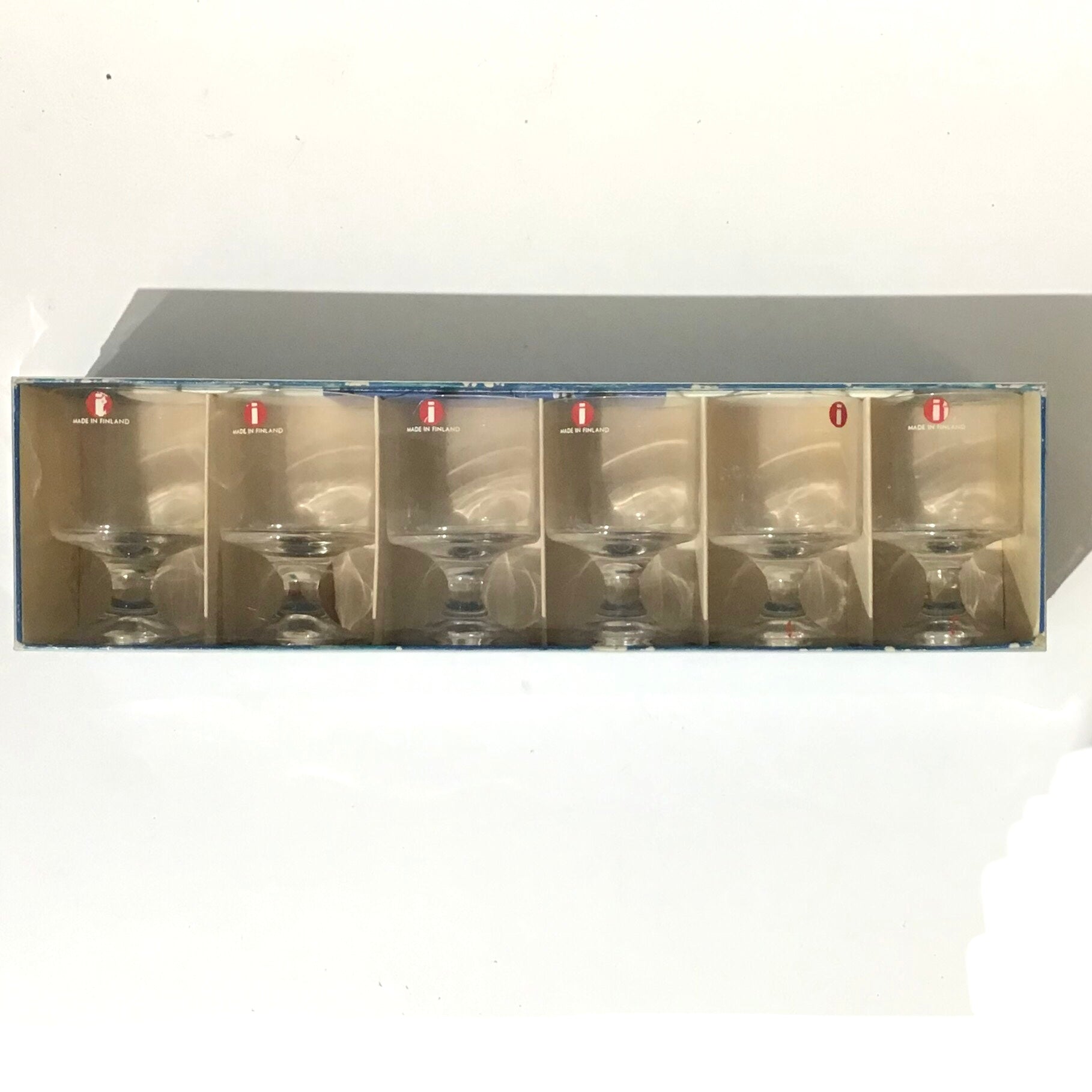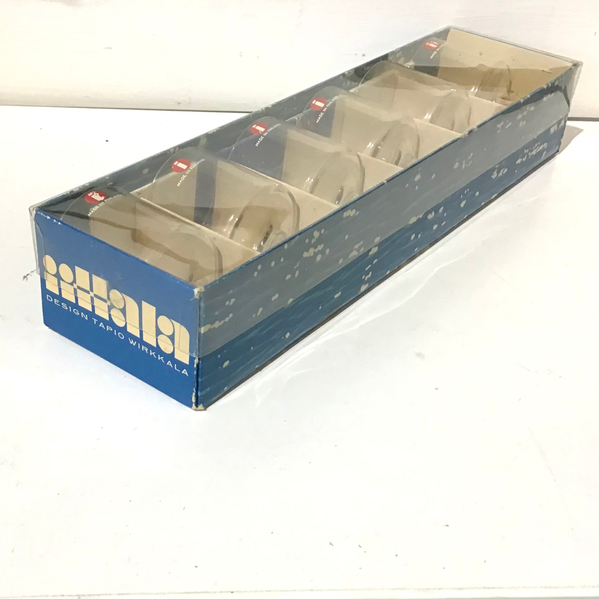 Boxed set of 6 schnapps Karelia glasses, designed by Tapio Wirkkala for Iittala in the 1960s. Brand new in original box, never been used. Comes with original brochure, made in Finland.