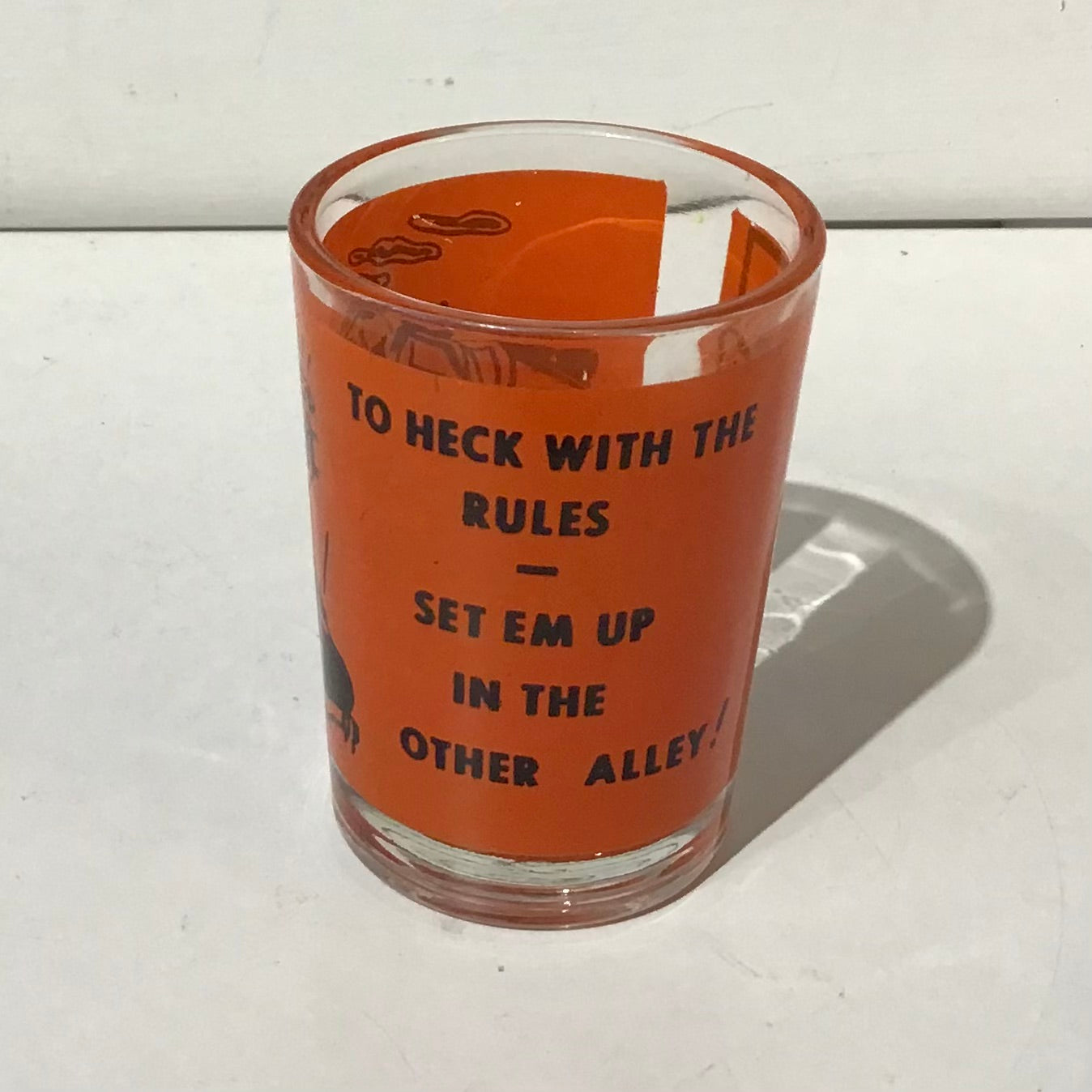 Vintage novelty shot glass featuring a cartoon of a man shooting at the bowling pins at the bowling alley and the phrase “TO HECK WITH THE RULES - SET EM UP IN THE OTHER LANE”. Made by Libbey glassware.