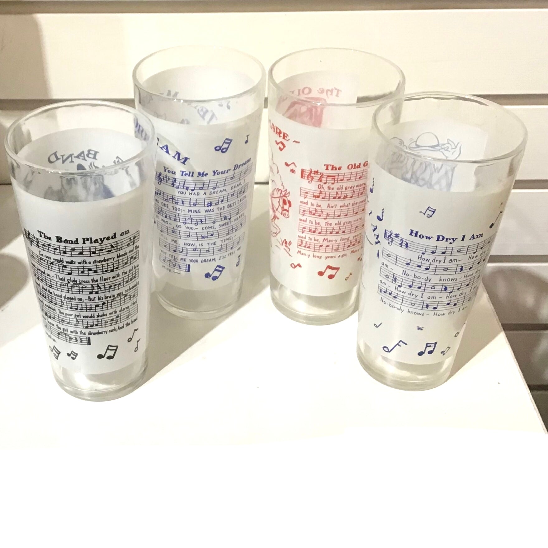 Set of four “Sing-A-Long” theme highball cocktail glasses, made by Hazel Atlas. These glasses were produced in the 1950s and 1960s, often as promotional items for Big Top Peanut Butter. Each features a different song and matching illustration, including “The Old Grey Mare”, “The Band Played On”, “Tell Me Your Dream”, and the classic “How Dry I Am”. Sold as a set.