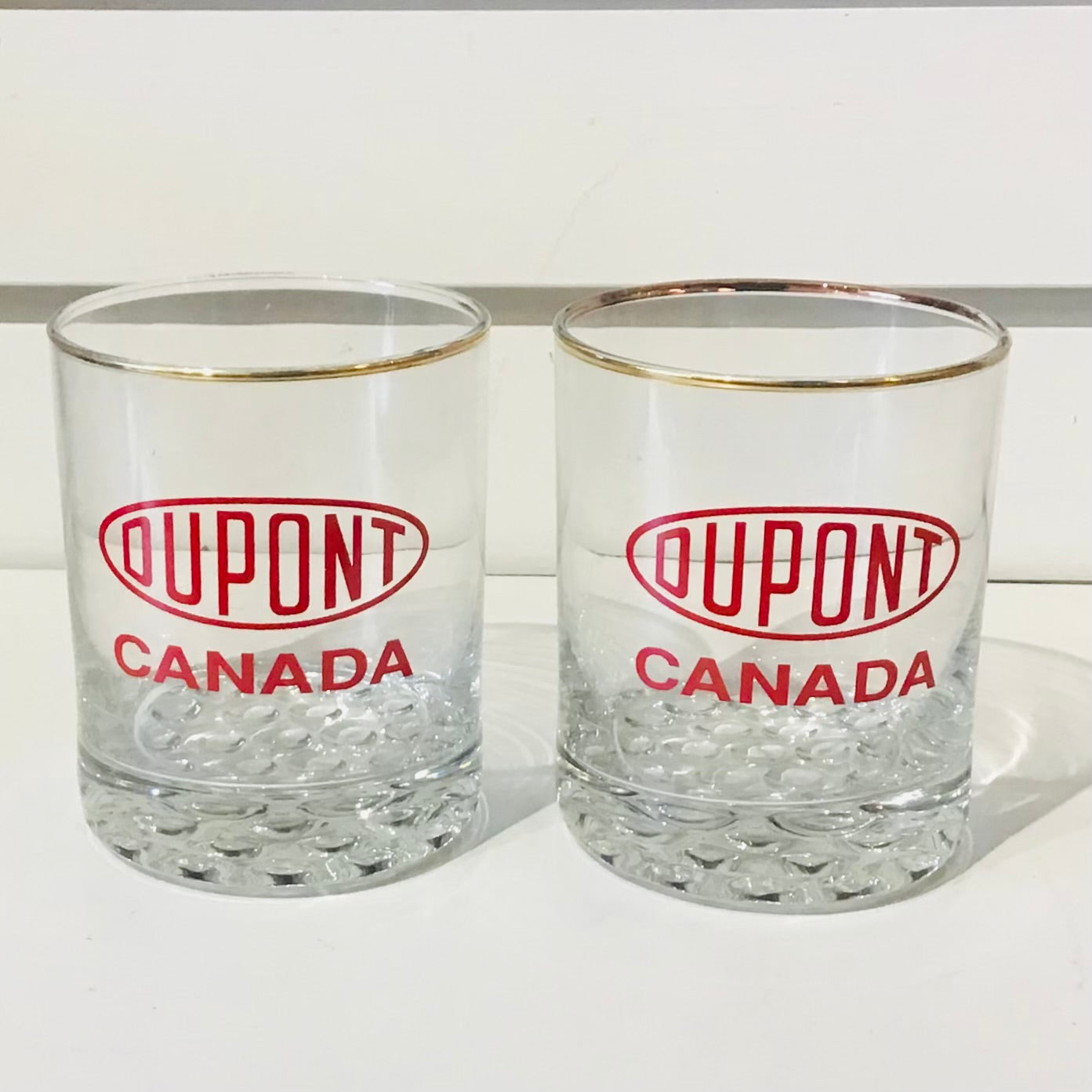 Pair of Vintage Dupont Canada promotional whiskey/double rocks glasses, featuring the company’s iconic red logo. Heavy hobnail style glass vase. Two pairs available.