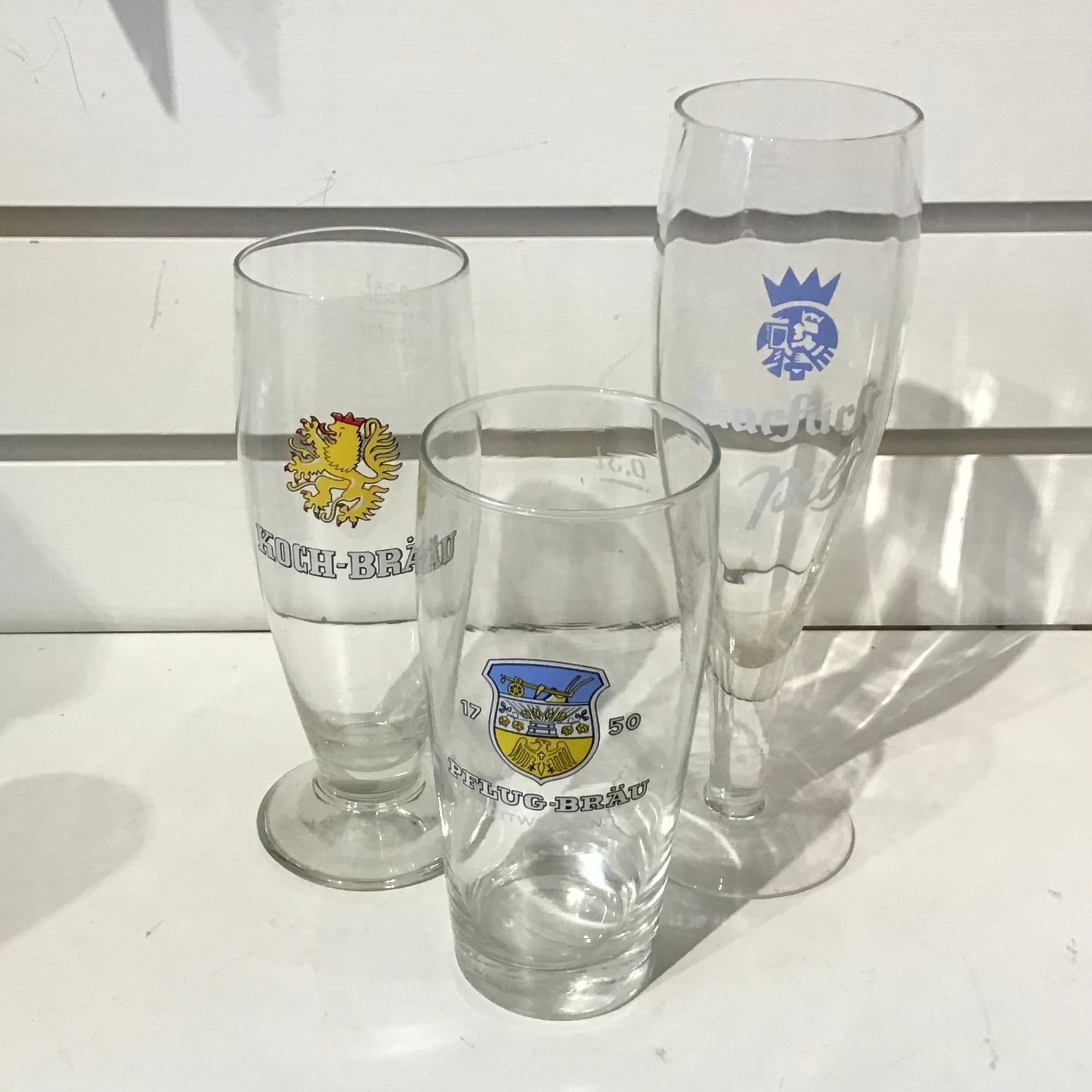 Vintage beer glasses from different German beers.