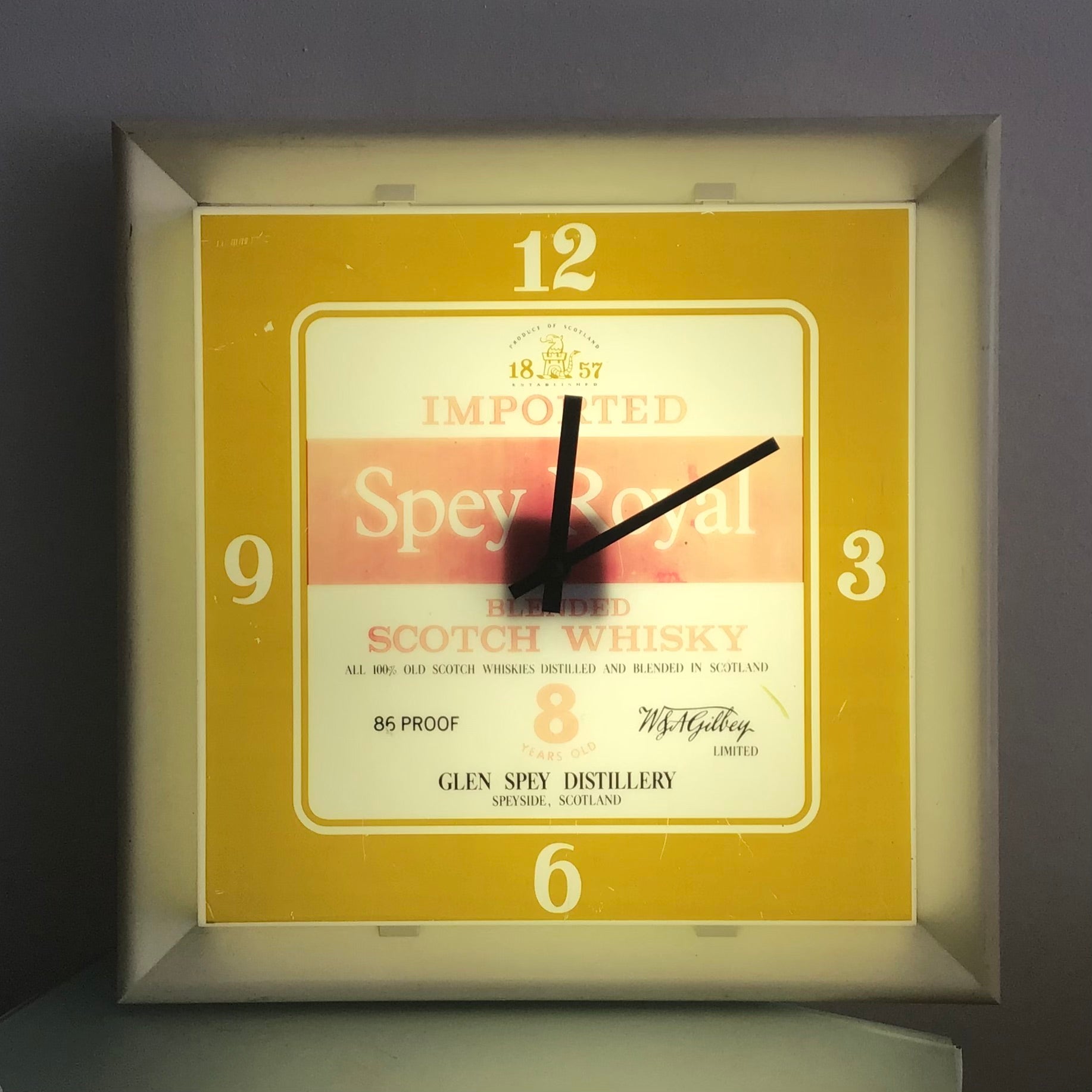Vintage light up promotional clock advertising Spey Royal Blended Scotch Whiskey. It has been converted to a battery operated motor with new hands, but needs to be plugged in to light up! definite, fading on advertising graphic, but still a fun piece for a bar.