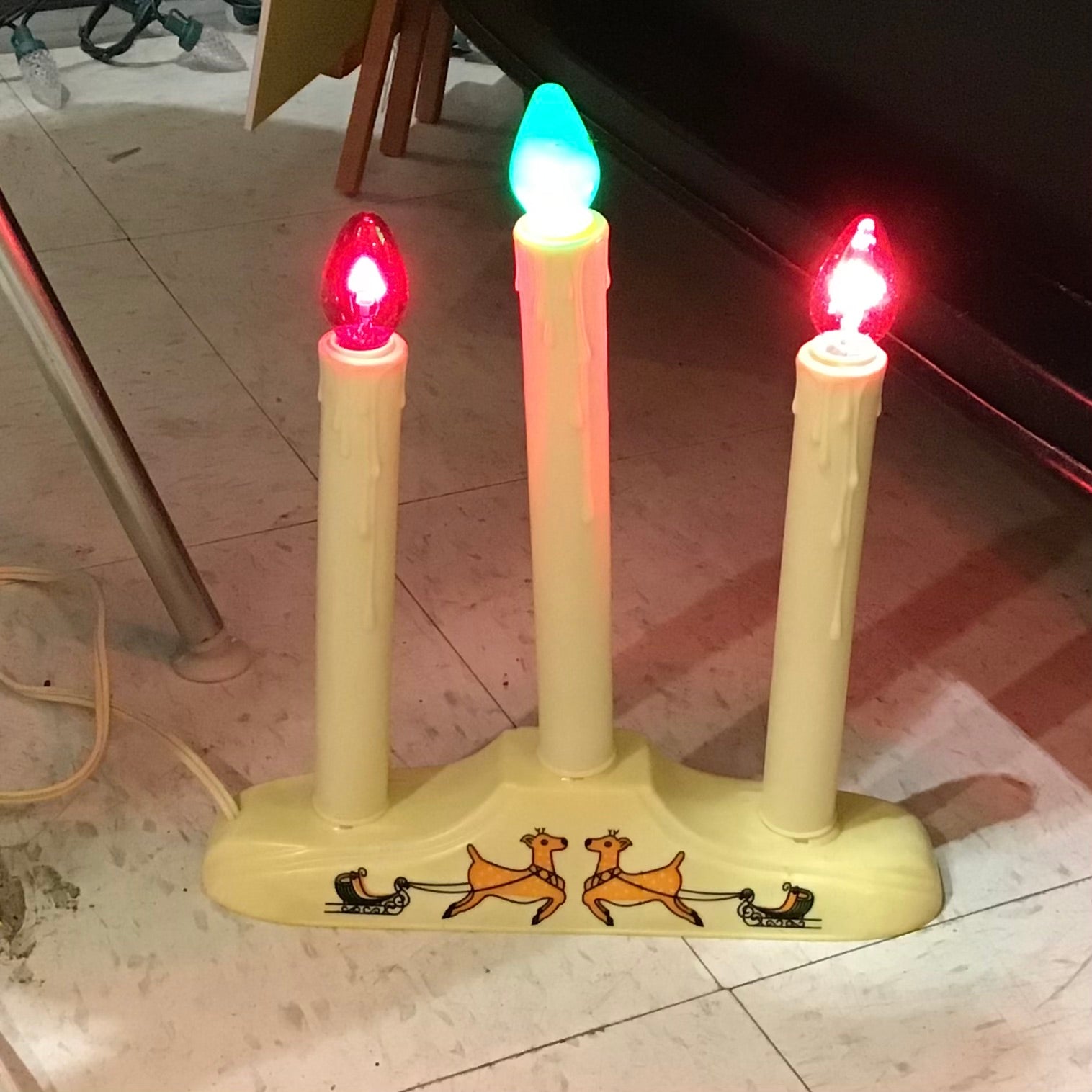 Vintage electric Christmas window candoliers featuring a darling illustration of deer pulling a sleigh. One socket isn’t working on one of them.