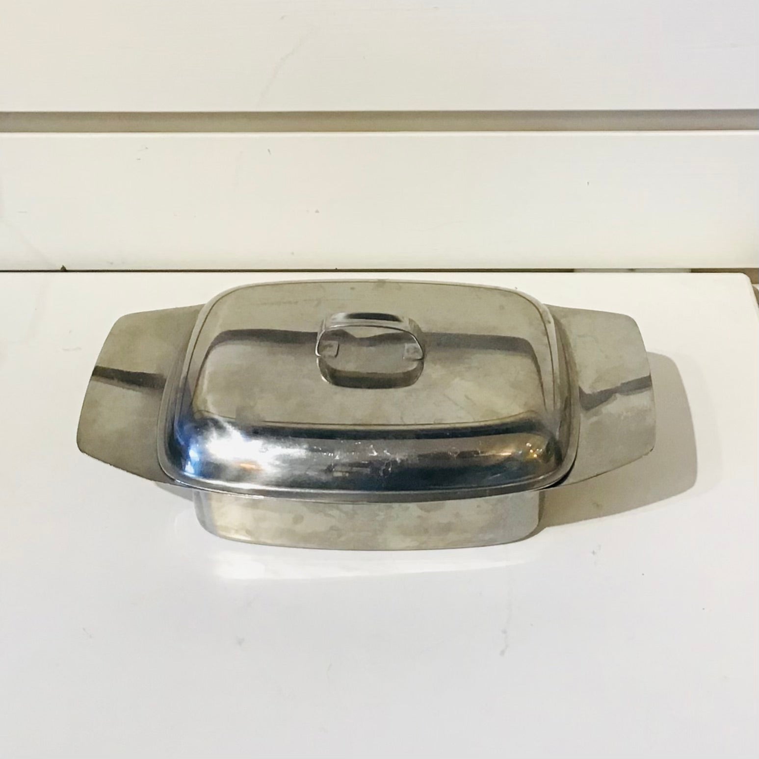 Vintage lidded stainless steel butter dish.