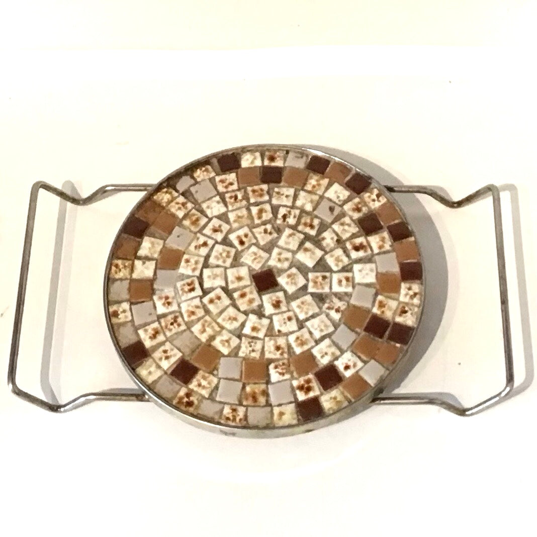 Vintage circular tile trivet, featuring brown, taupe and mottled tiles in a brass frame with handles and feet. Perfect for keeping your teak tabletop safe from your afternoon tea!