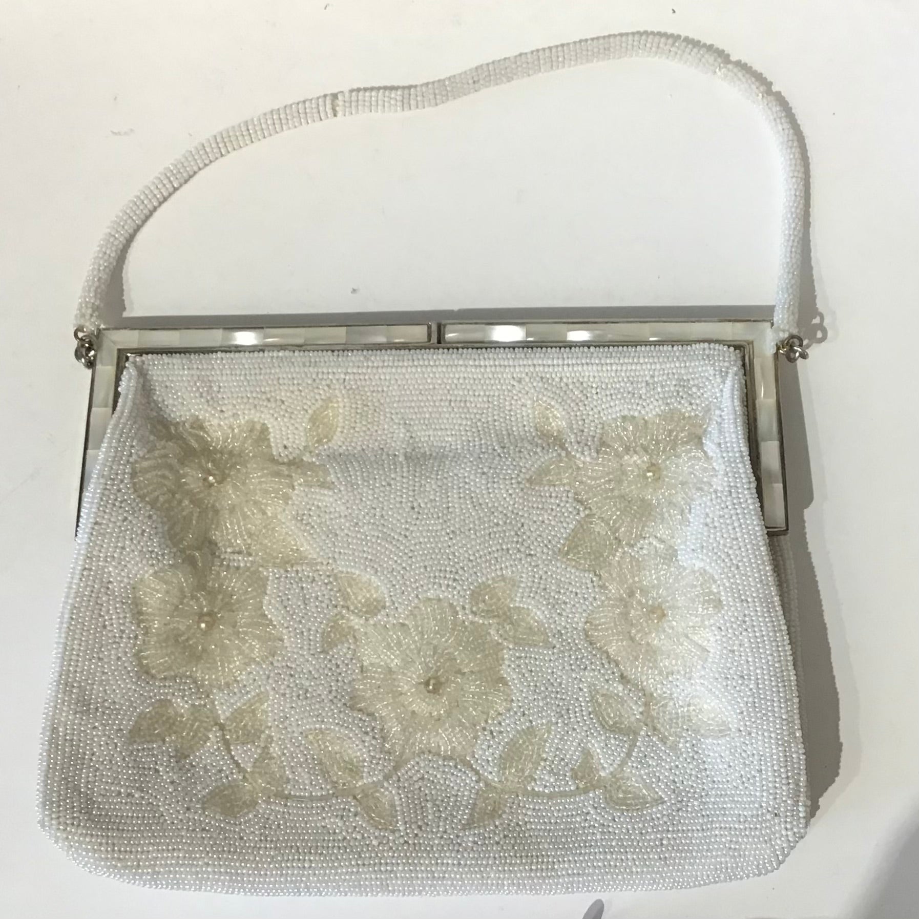 White beaded handbag with beaded handle & mother of pearl inlay on closure frame. White satin lining - made in Japan