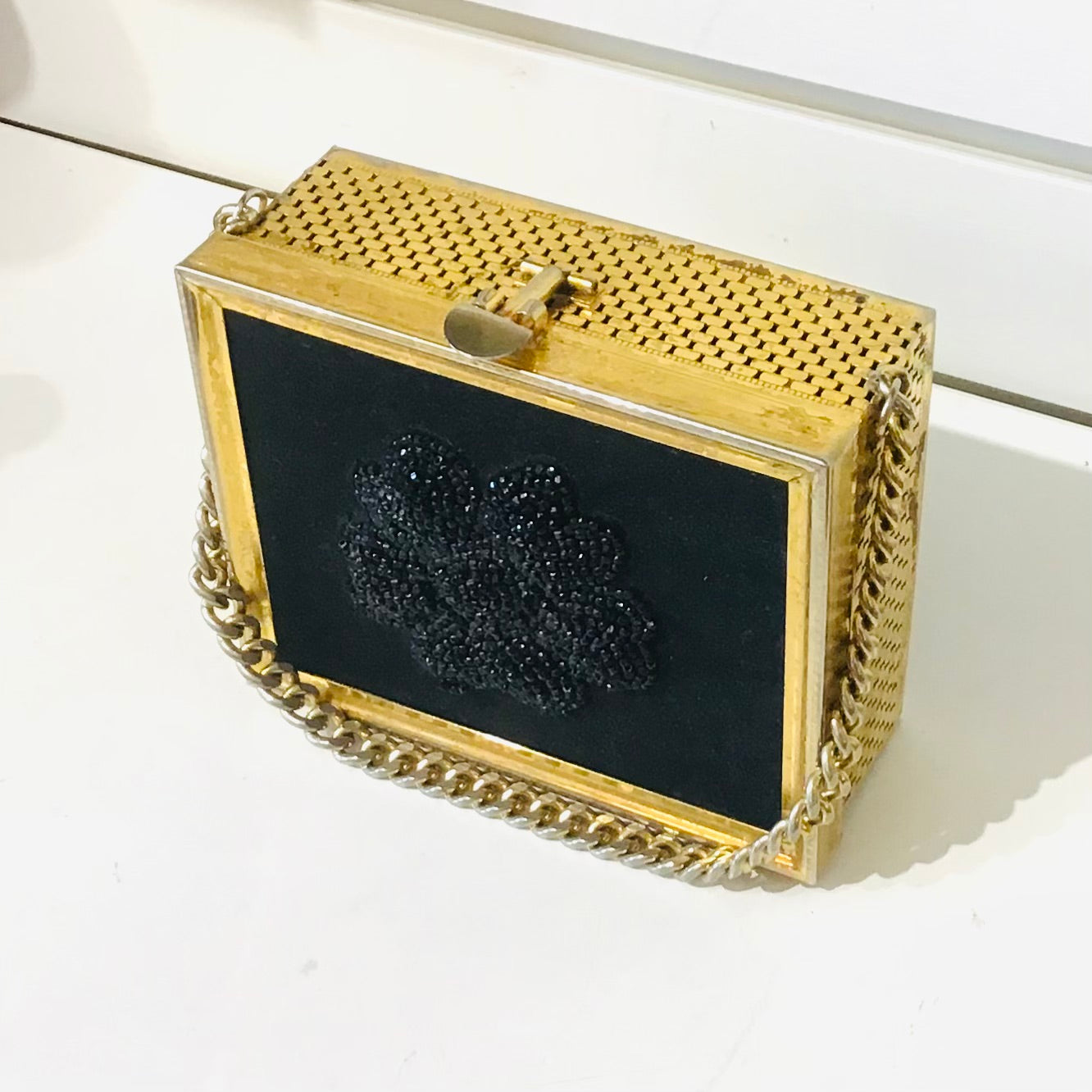 Gold metal cage frame with black satin lining and beaded flower - interior panel has mirror