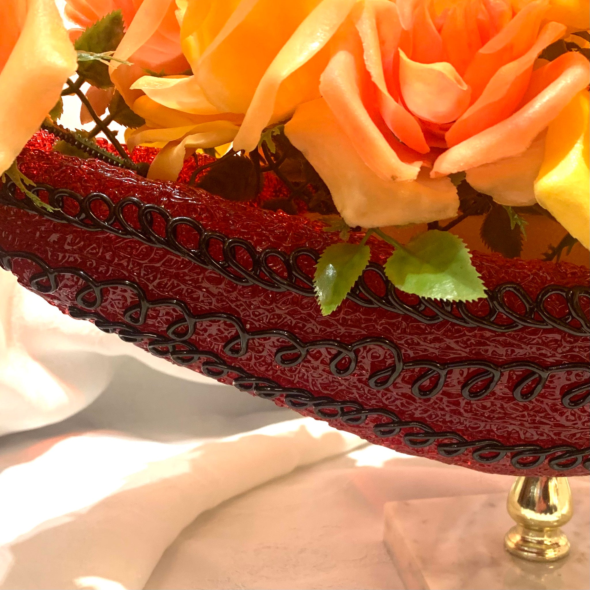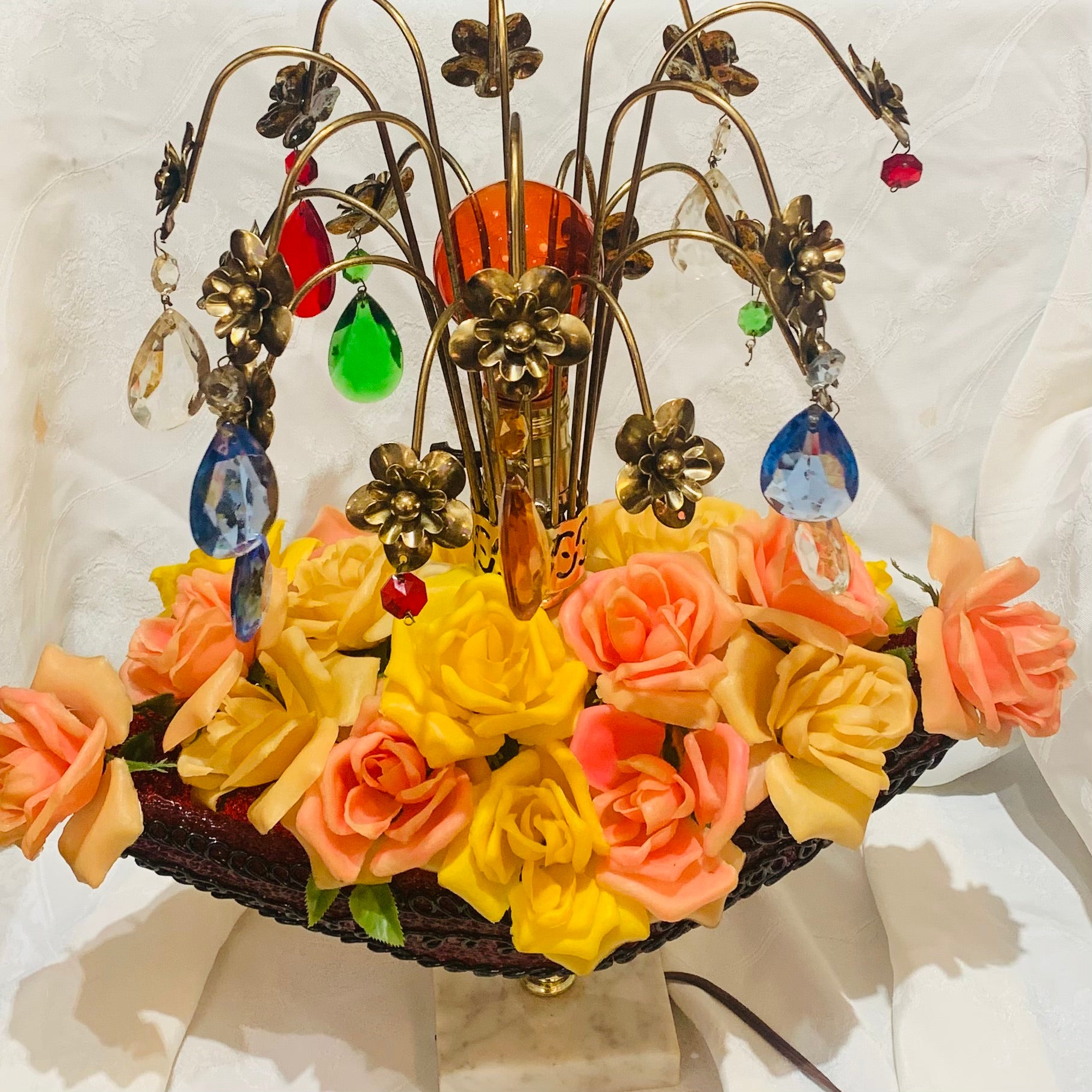 Kitschy Sixties spun acrylic spaghetti lamp. Boat base in red & black with orange and yellow plastic flowers with brass arms ending in brass flowers or coloured glass chandelier drops, all balancing on a marble base. It is truly a thing of beauty.