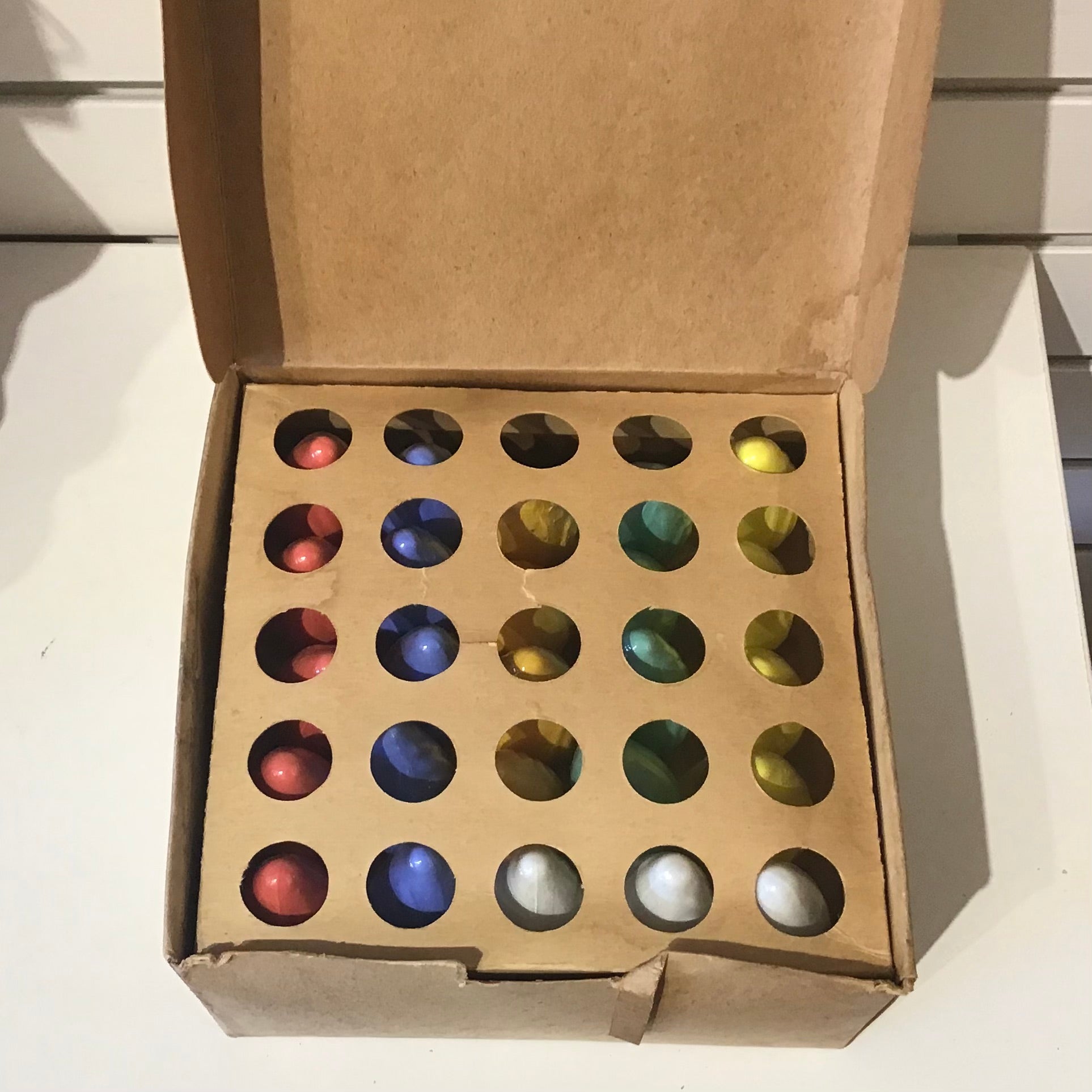 Dead stock box of 25 C 9 1/2 Swirl Flame light bulbs. 5 coral/pink, 5 blue, 4 gold/yellow, 4 mint green, 4 pale yellow and 3 white. Bulbs stamped GE. Original box, never been used. Untested. Made in Canada by General Electric.