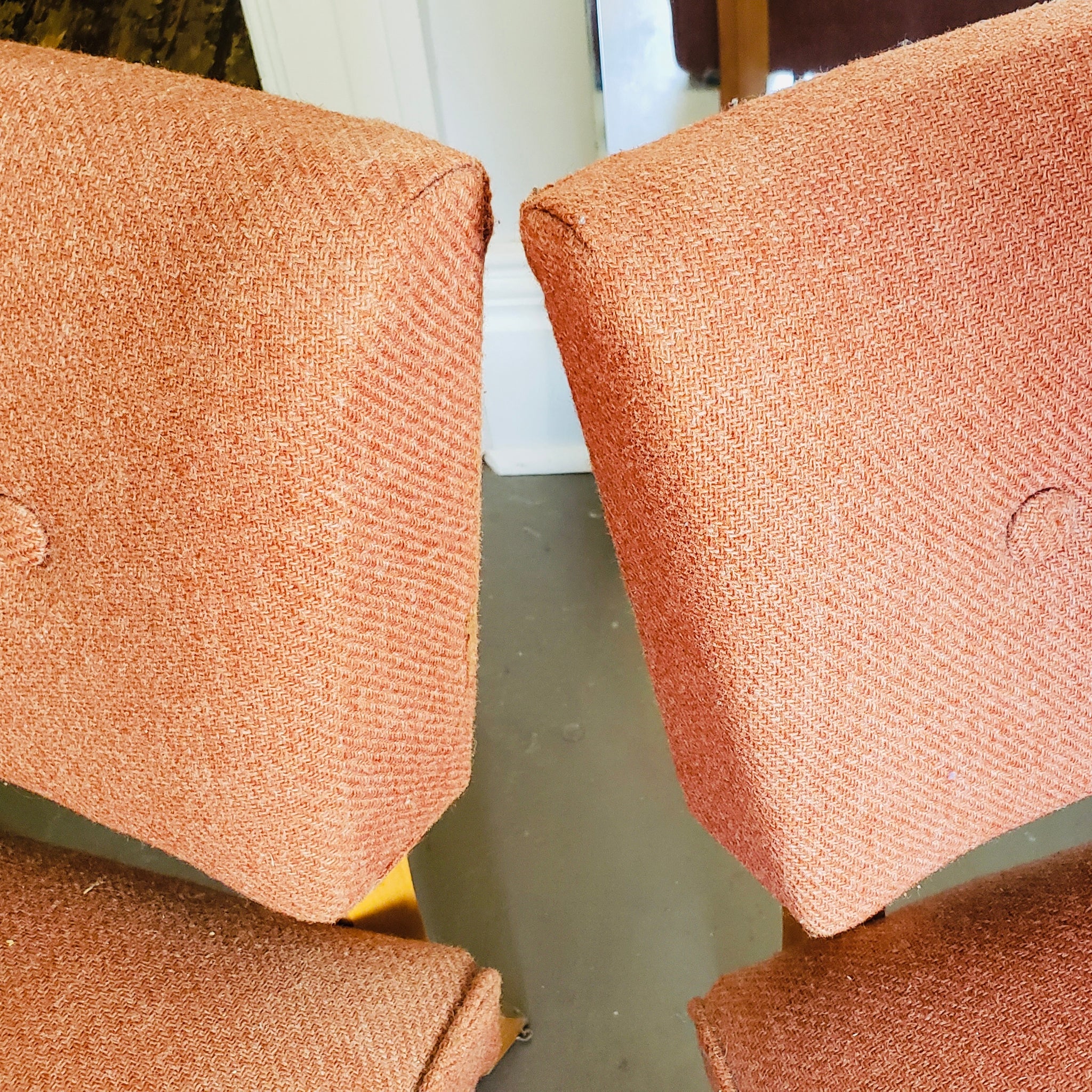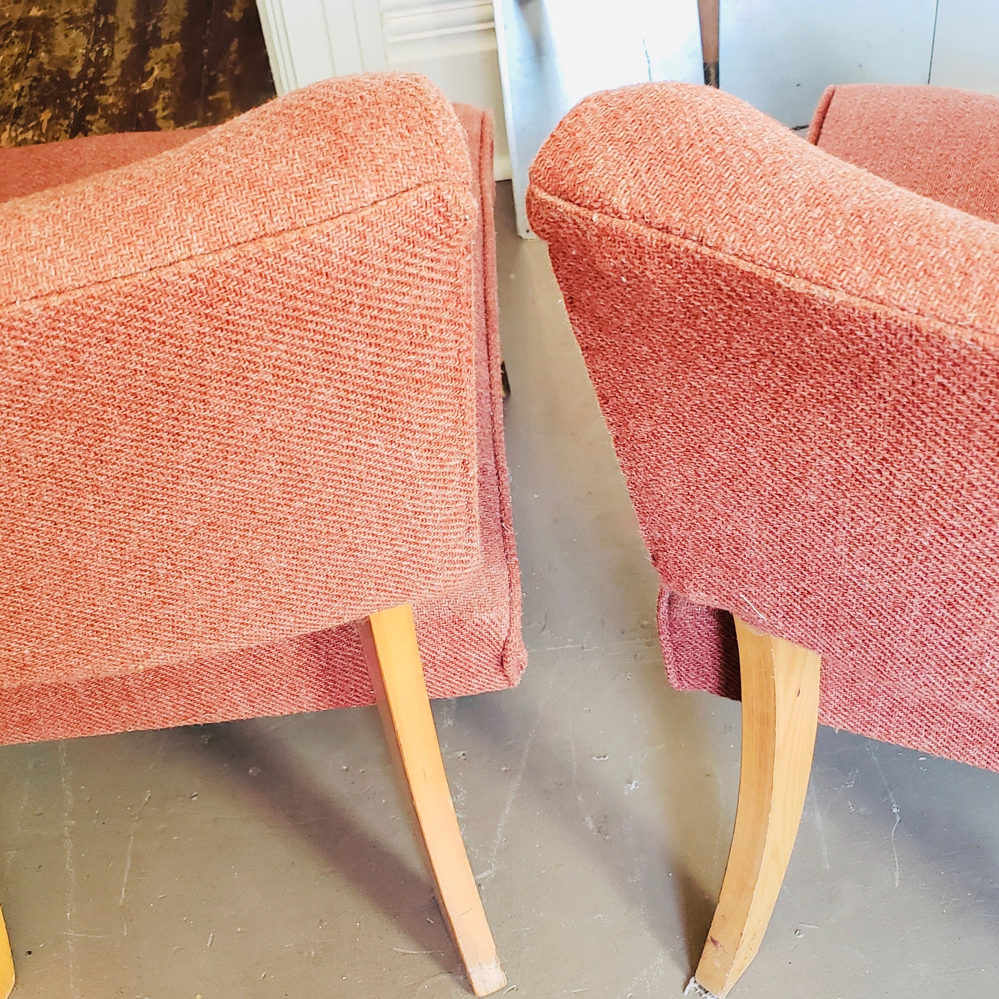 1950s blondewood slipper chairs with dusty rose upholstery. Springs have been repaired on one chair. Two available, being sold separately.
