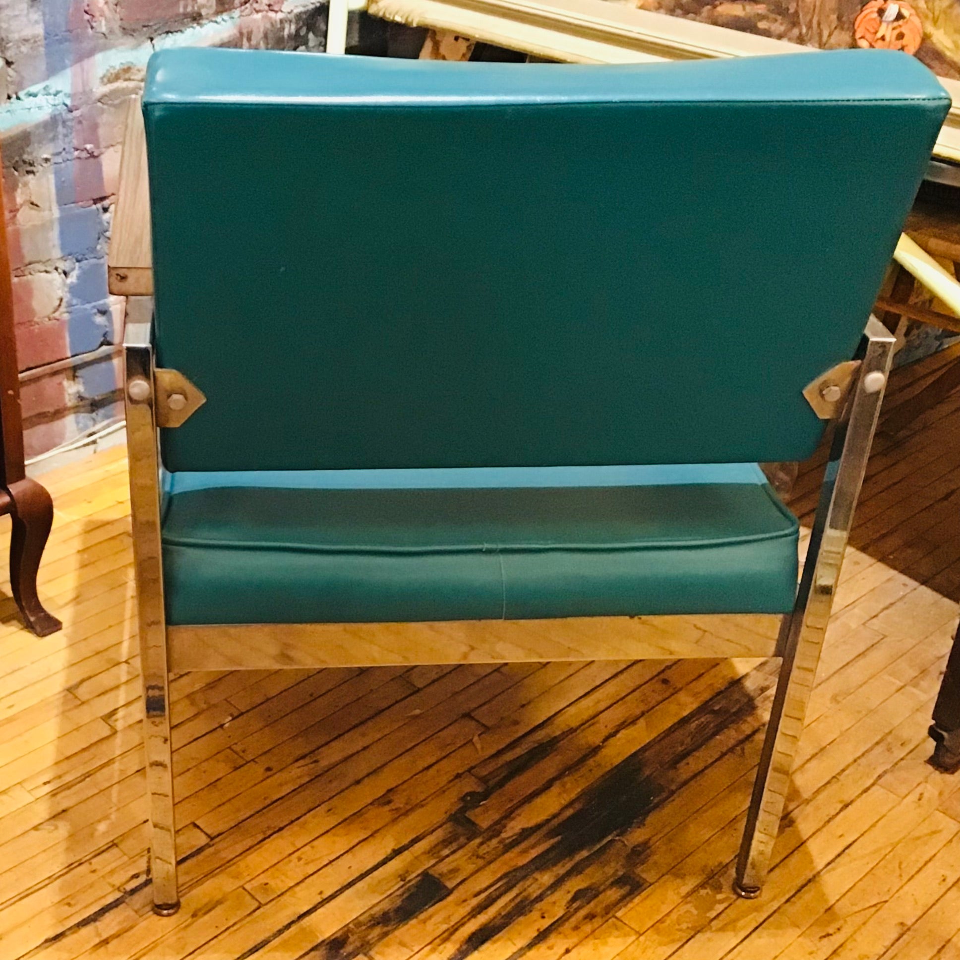 Vintage chrome frame office side chair or waiting room chair. Original turquoise vinyl upholstery and and wood grain laminate arm rests. Excellent vintage condition.