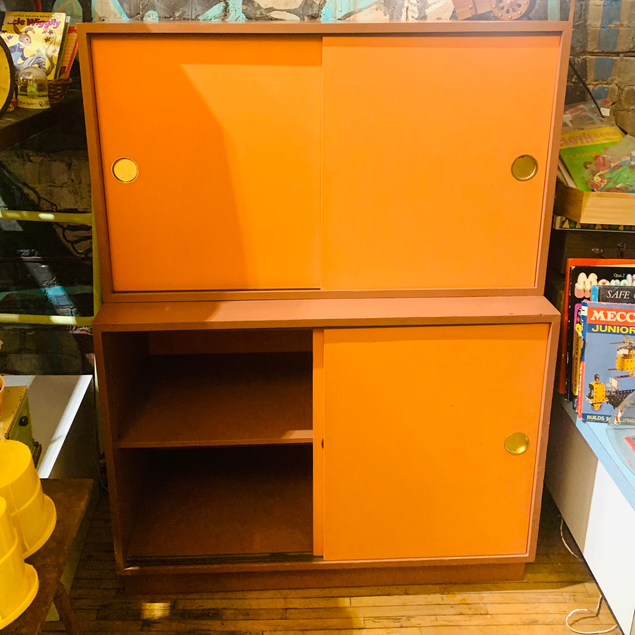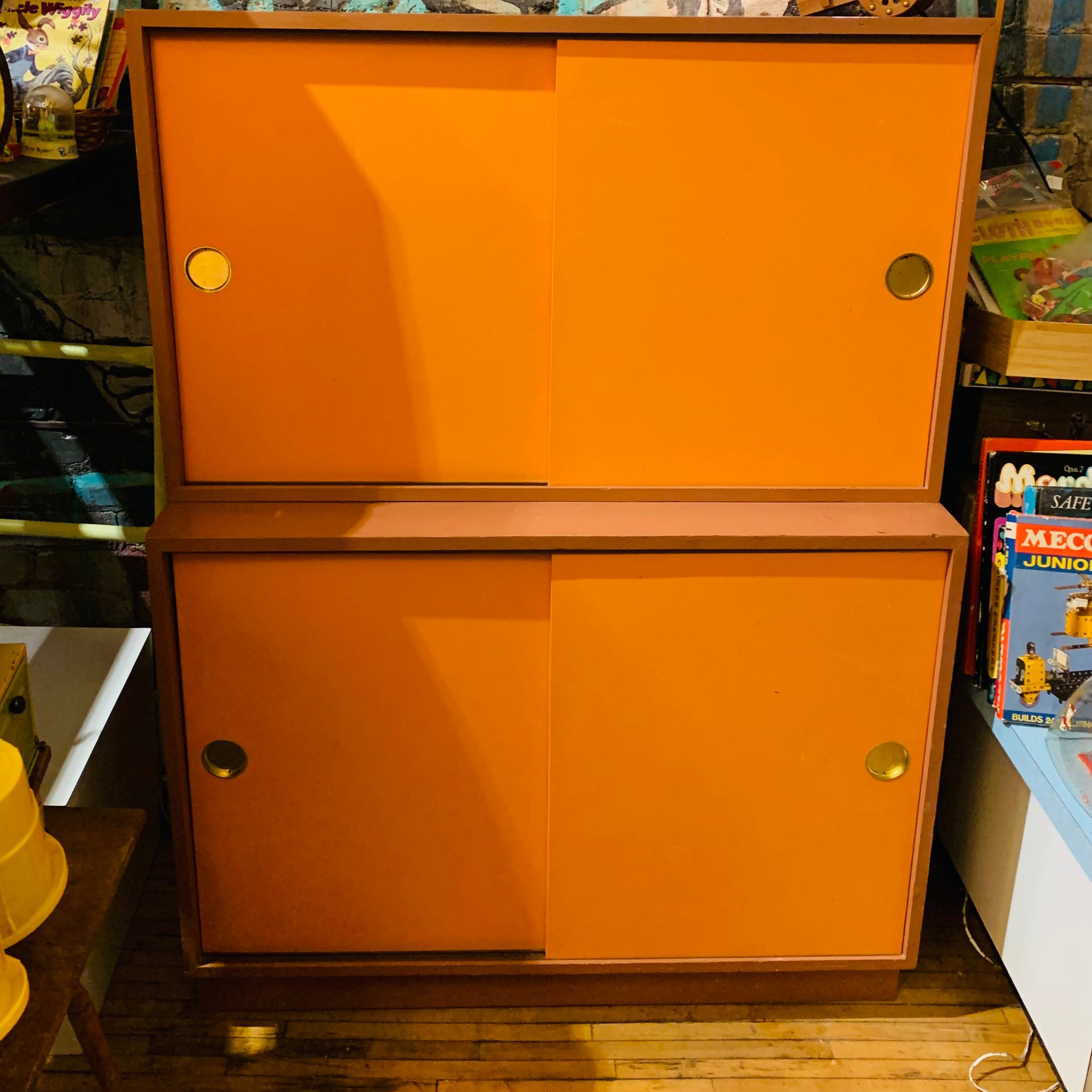 Vintage handmade 2 piece shelving cabinet with fixed shelves, sliding doors and plinth base. Painted wood with brown cabinets and orange doors and back panels. Doors have inset brass circle pulls. Built in December 1976 by R.J. Sandusky in Clarkson, Ontario, Canada. Perfect for a Brady Bunch style rec room.