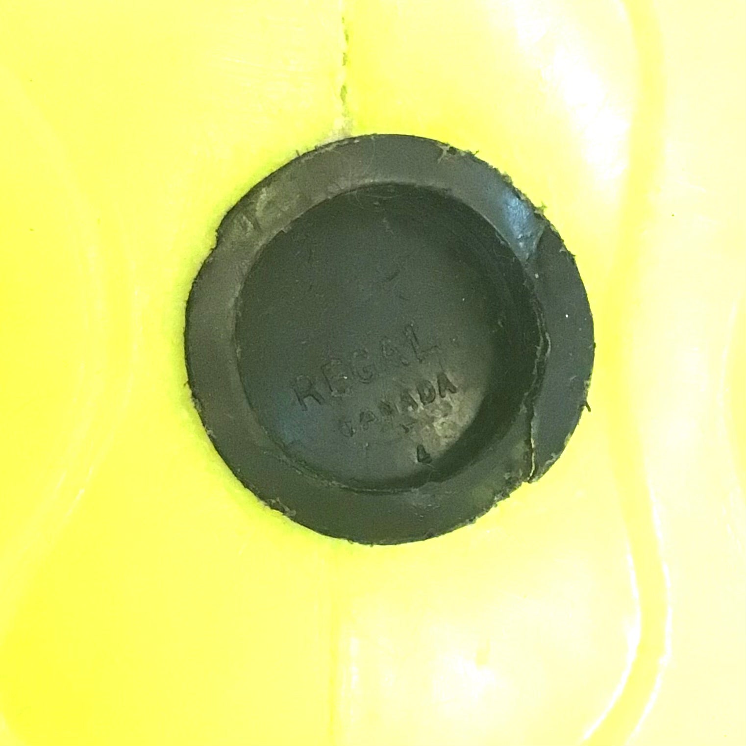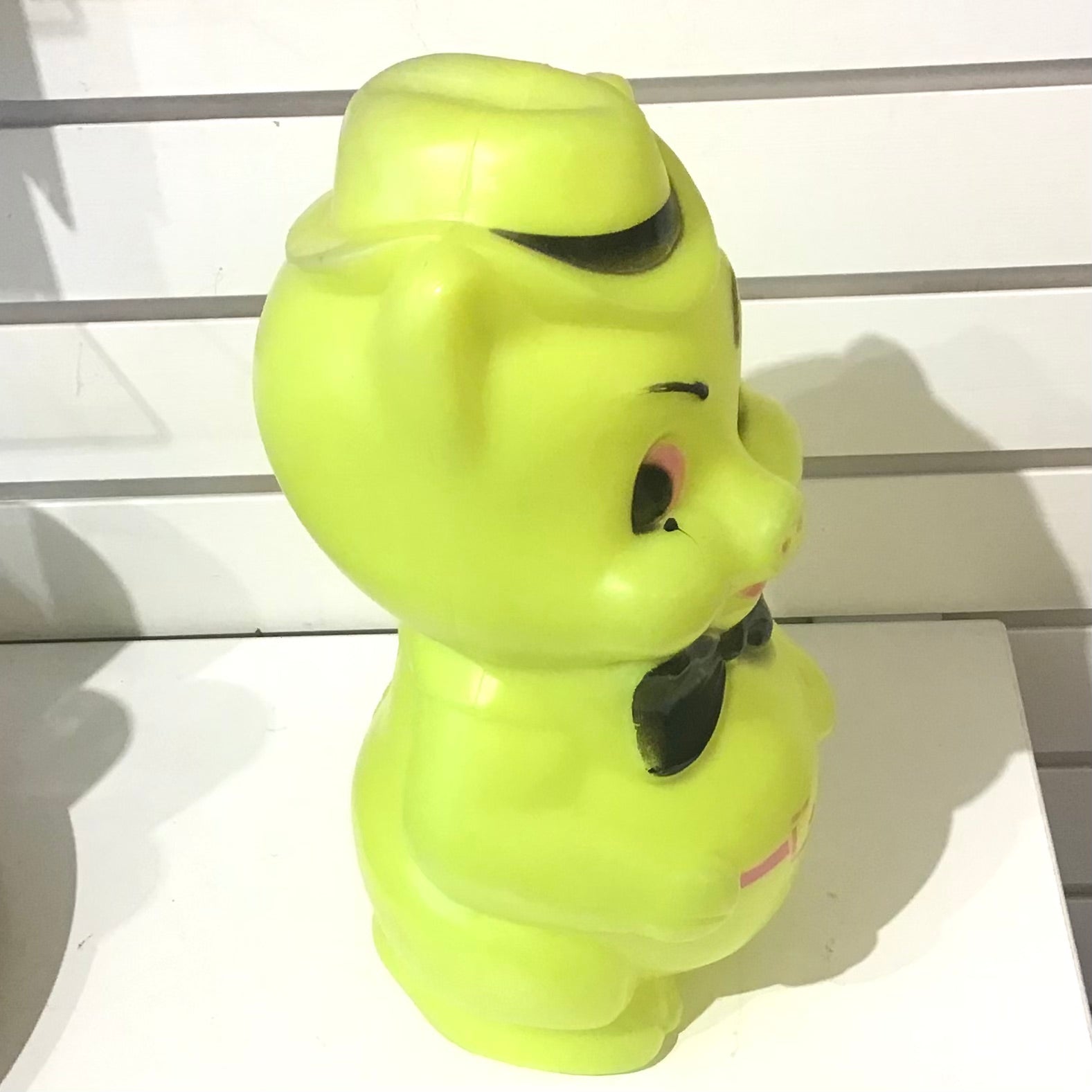 Vintage plastic blow mould Porky Pig style piggy bank. Yellow with pink and black painted details. Made in Canada by Regal.
