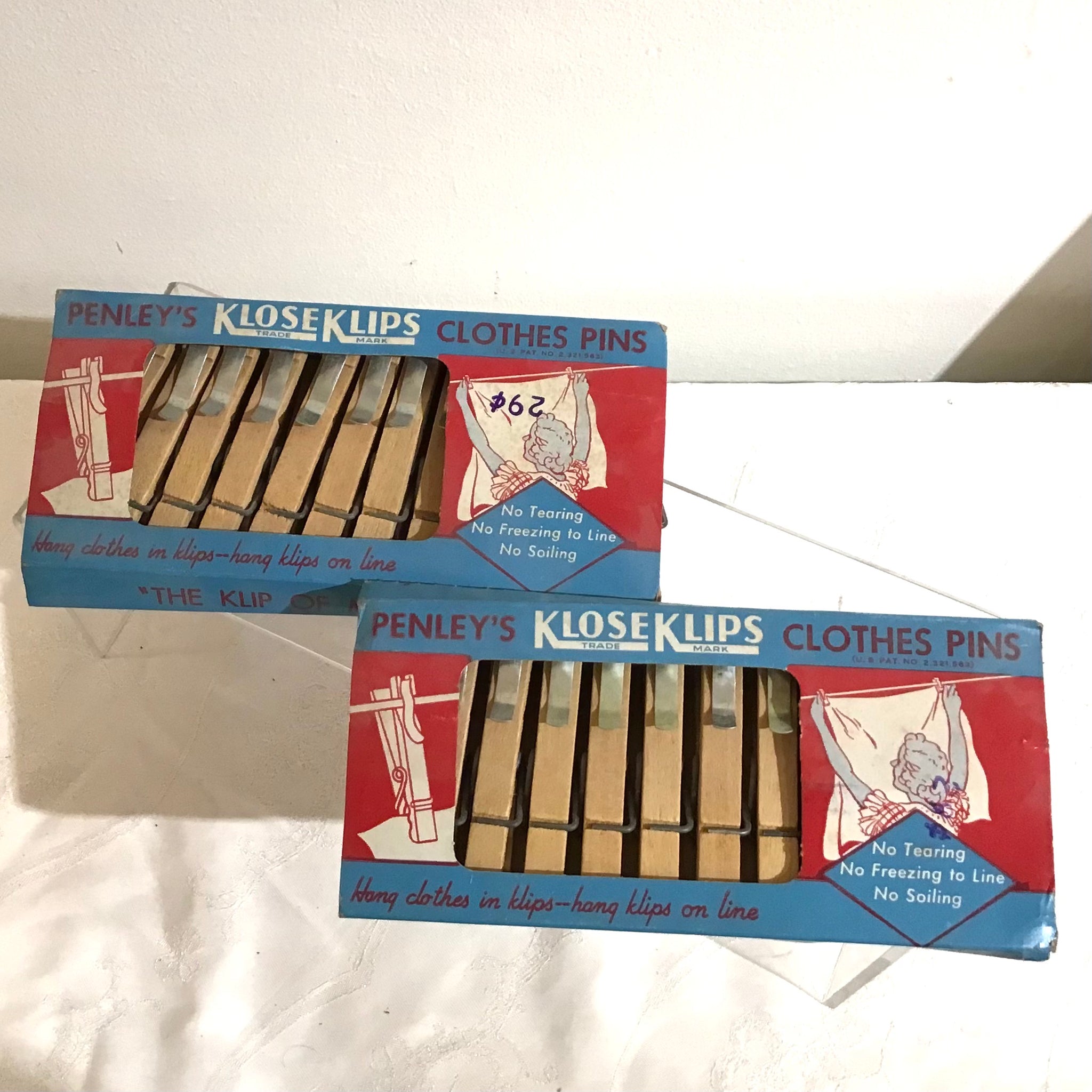 Vintage Klose Klips clothespins in the original packaging. Never been used. Great for display in your retro laundry room.