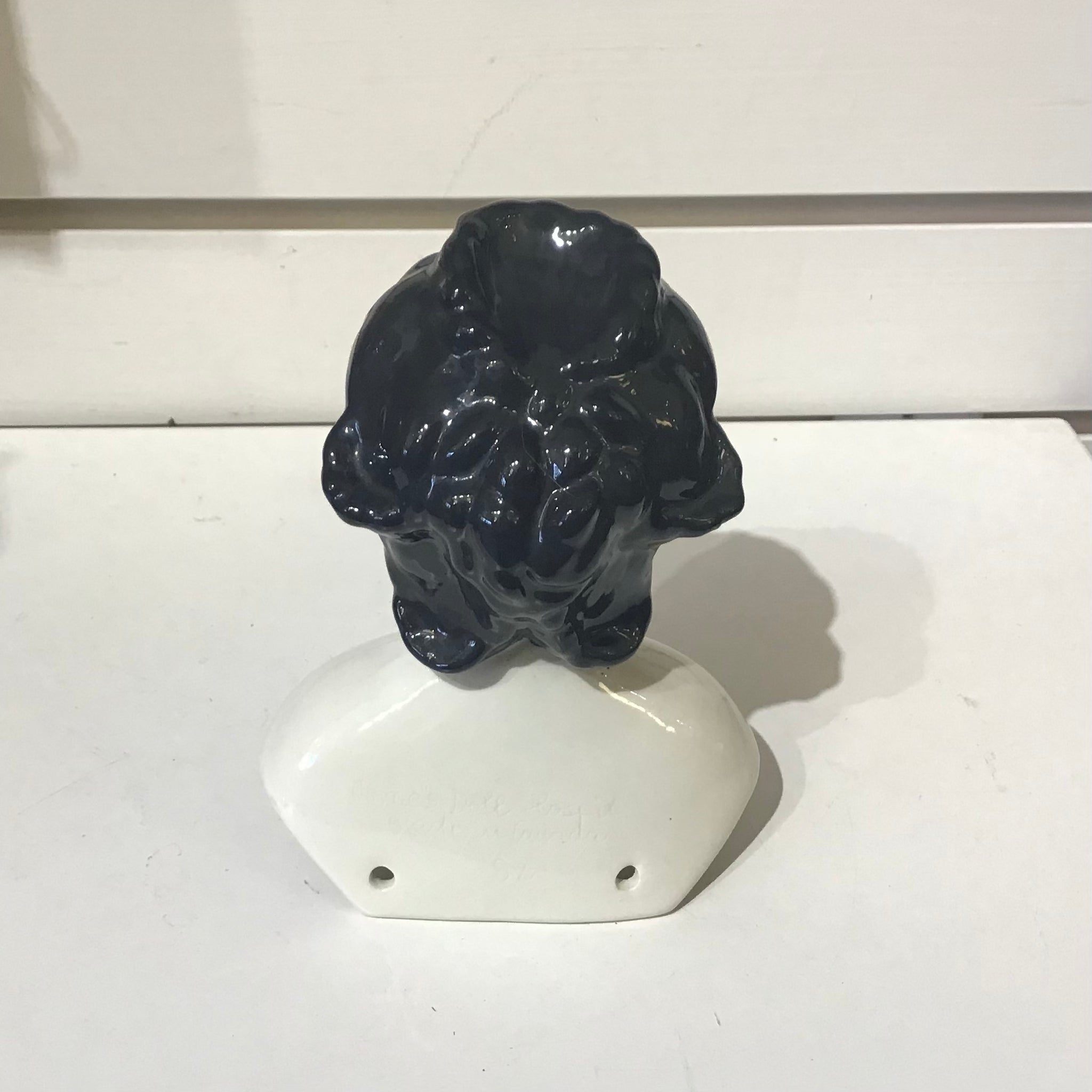 Vintage Victorian style China doll head featuring a demure visage with an ornate braided hairstyle. Signed “Anne’s Doll Hospital, made in Canada, 82” on the back.