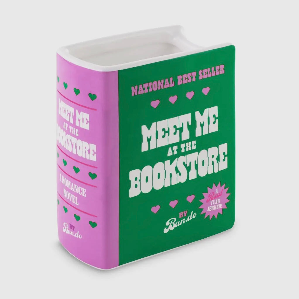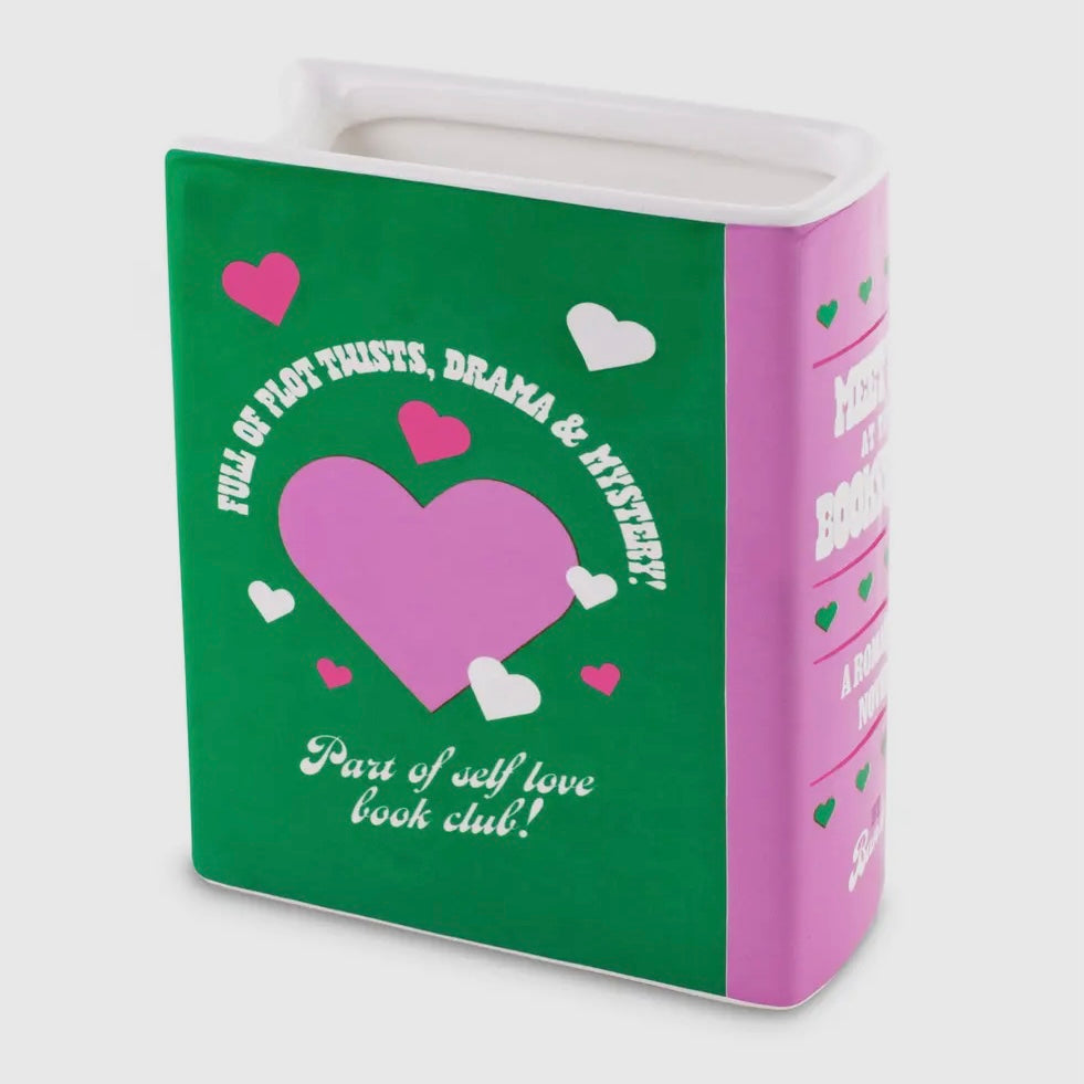 Pop art style Meet Me at the Bookstore book shaped vase. Features retro style graphics in teal and purple in a white glaze. Designed in Los Angeles.