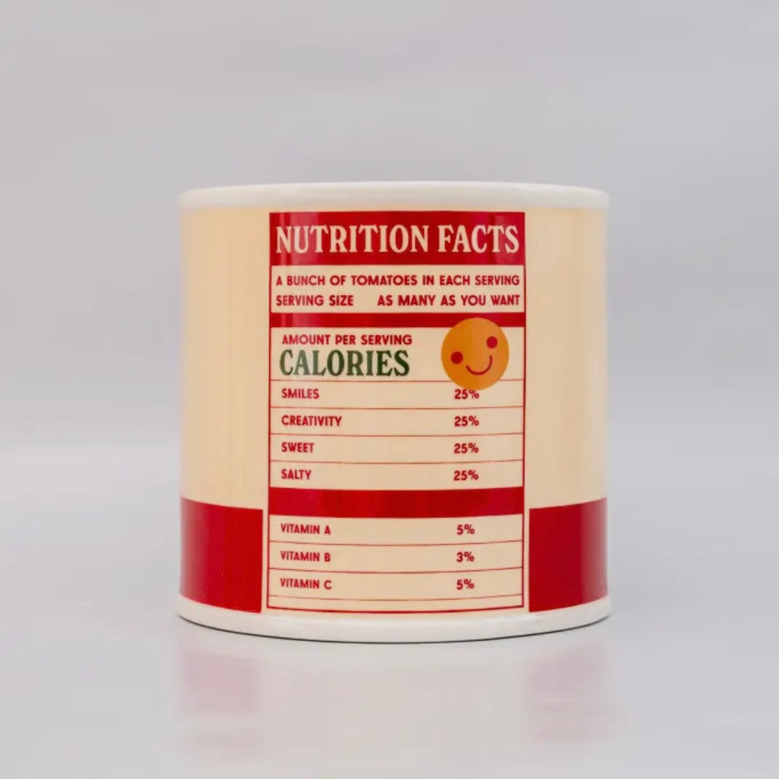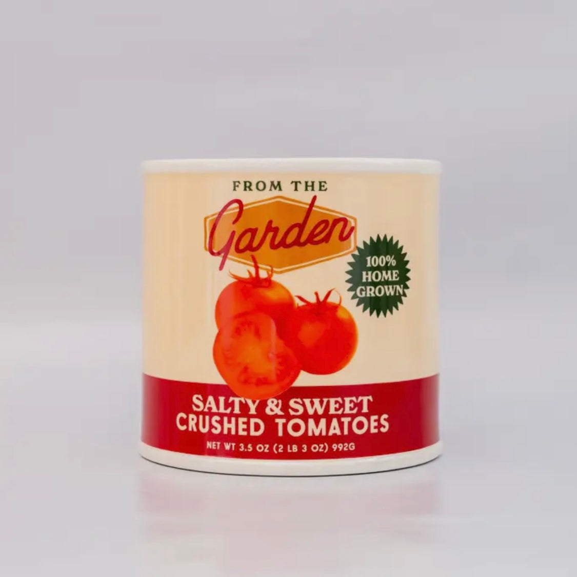 Pop art style crushed tomato can shaped vase. Features retro style graphics in red, yellow and green on a white glaze. Designed in Los Angeles.