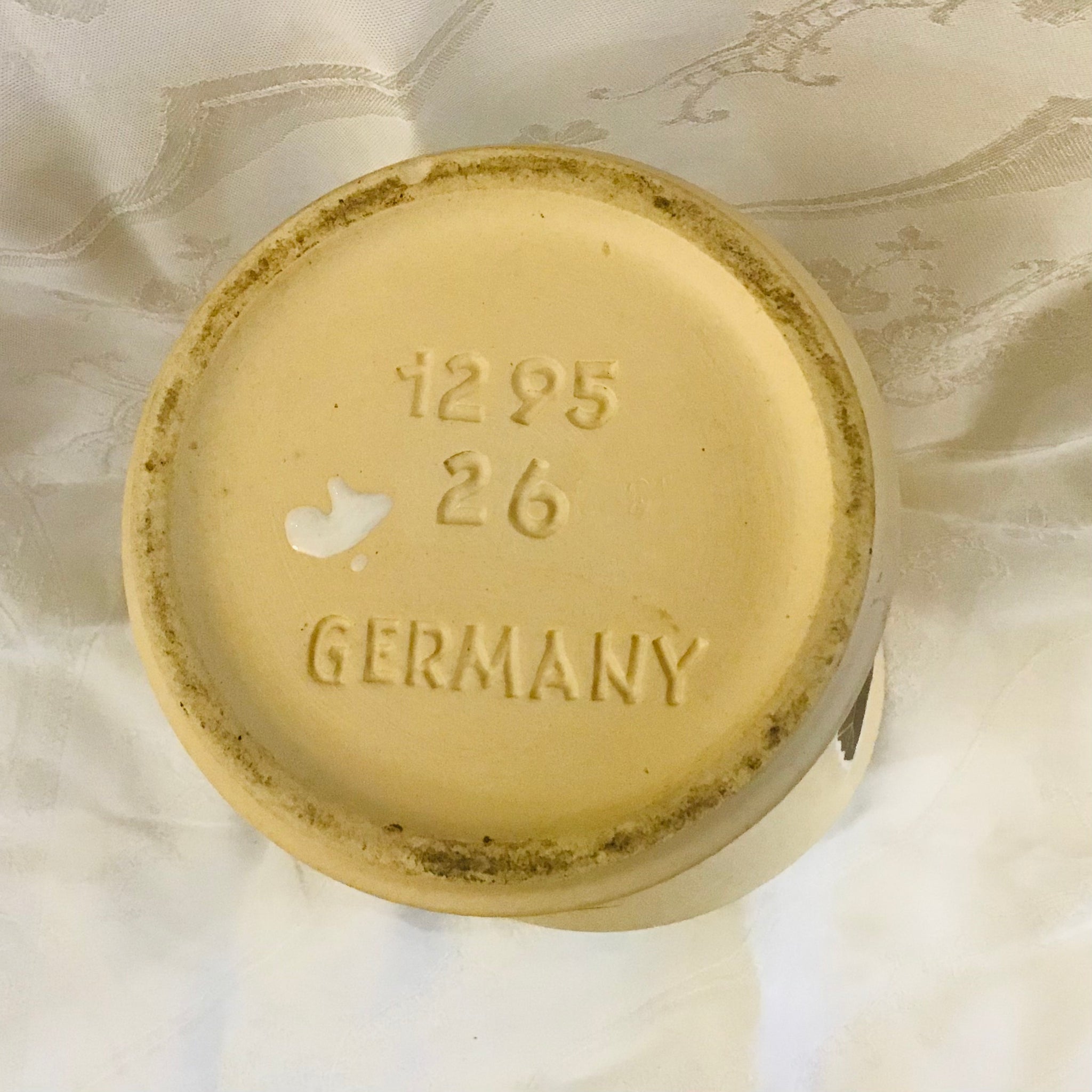 Vintage hourglass ceramic vase with exterior matte glaze finish featuring abstract leaves. Asymmetrical mouth. Made in Germany by Dumler & Breiden.