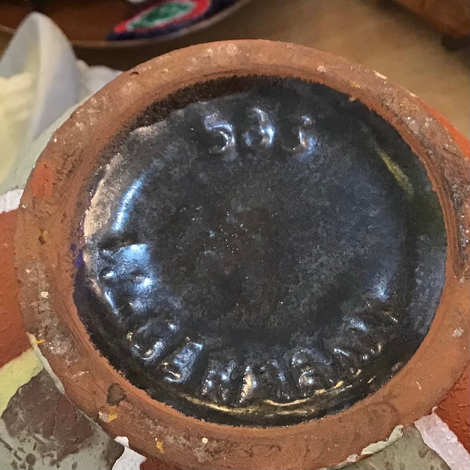 Vintage West German pottery vase featuring matte striped glaze on textured finish. Measures 8 3/4” tall.