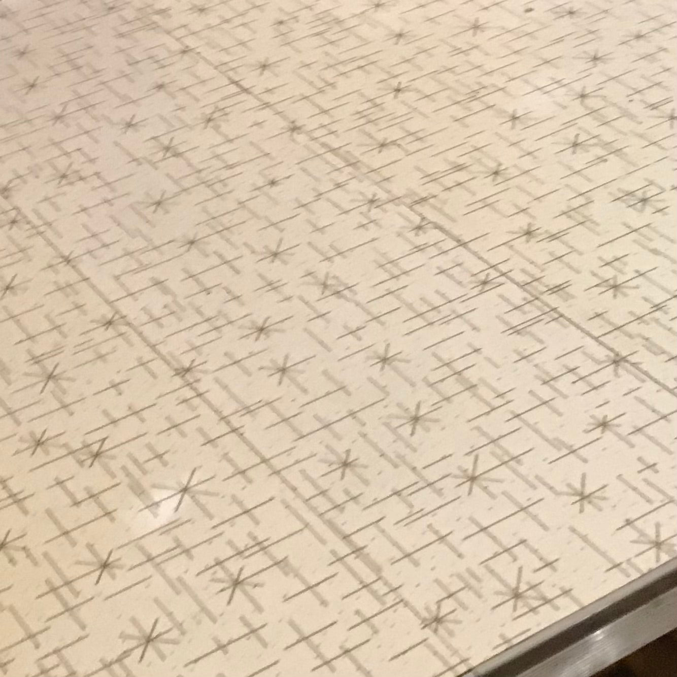 Vintage 1950s chrome frame kitchen table. White laminate surface with gold pings. Has removable leaf. Some discolouration on laminate consistent with age.