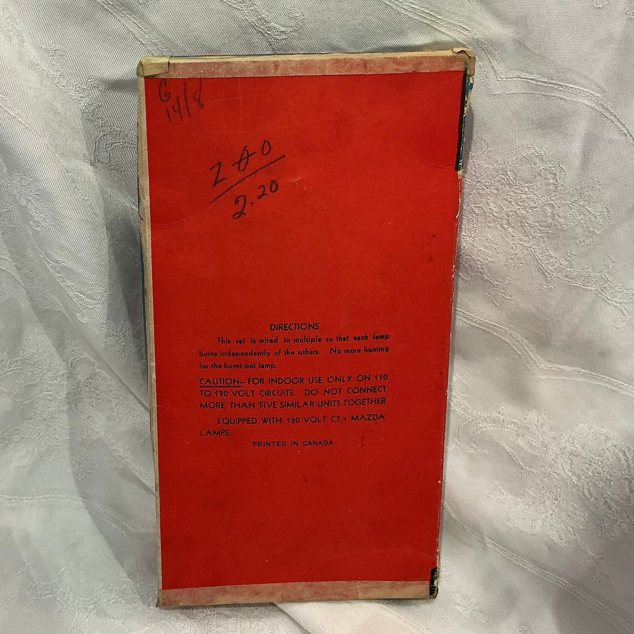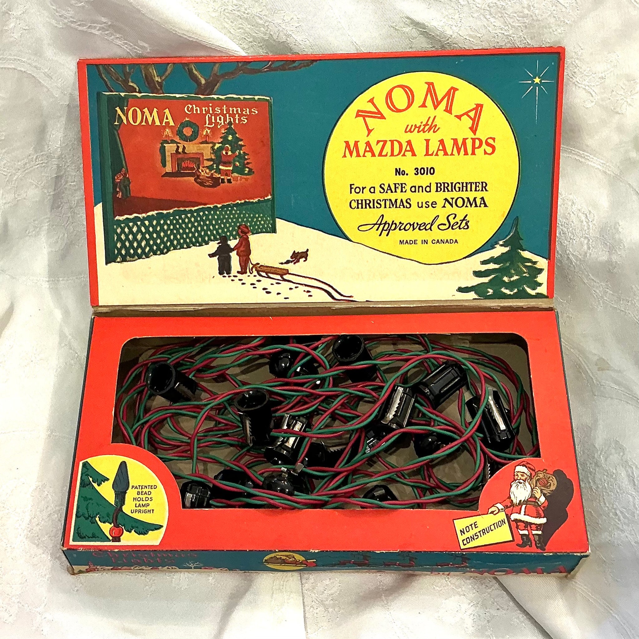 1930s/1940s Noma Mazda Christmas tree string lights in original box. Made in Canada. Bulbs not included. Untested.