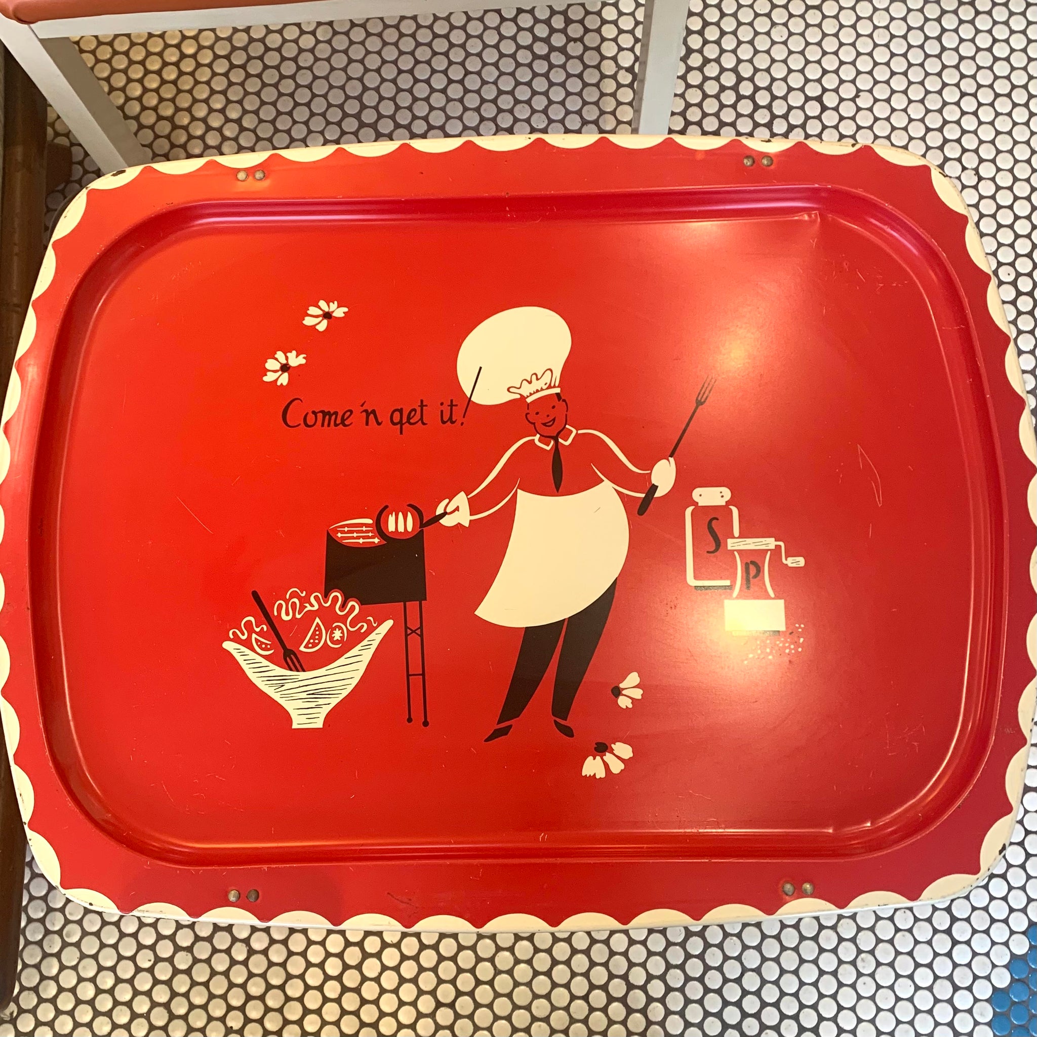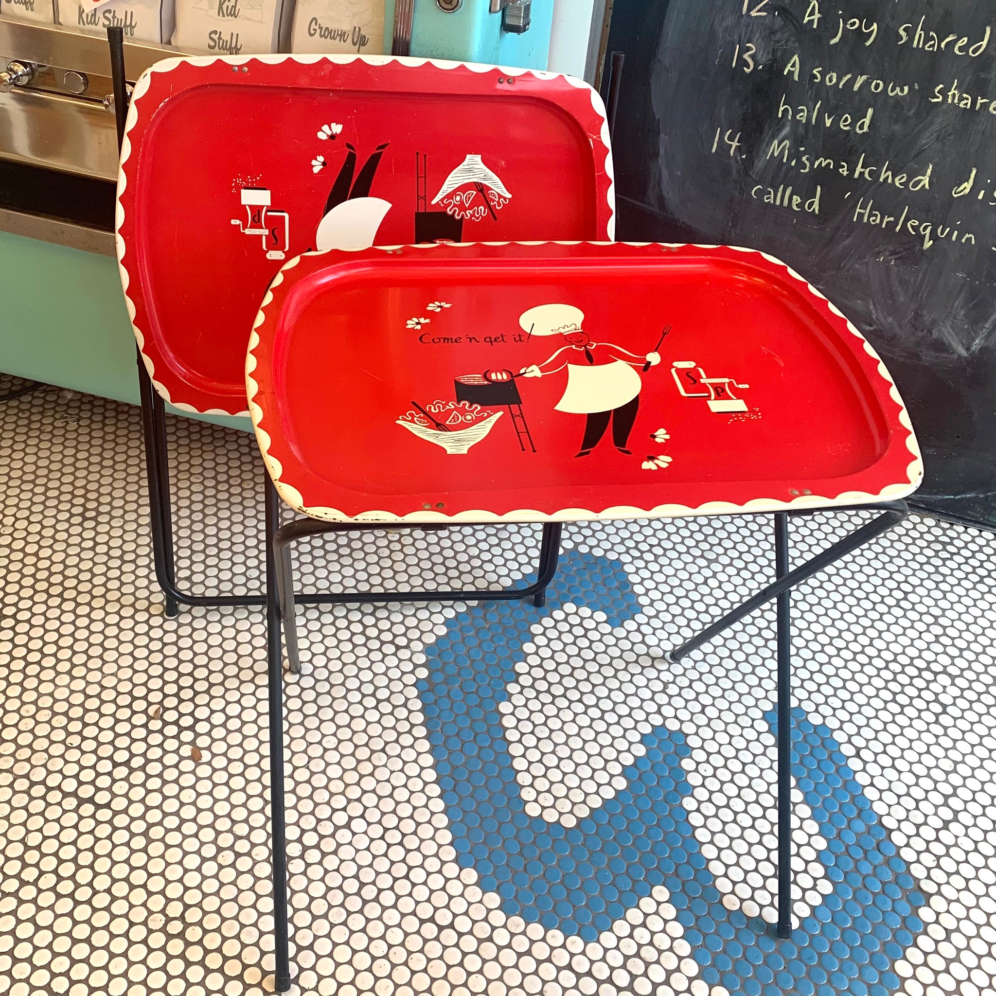 Vintage TV tray featuring a Marcelline Stoyke red, white and black BBQ theme illustration. Two available.