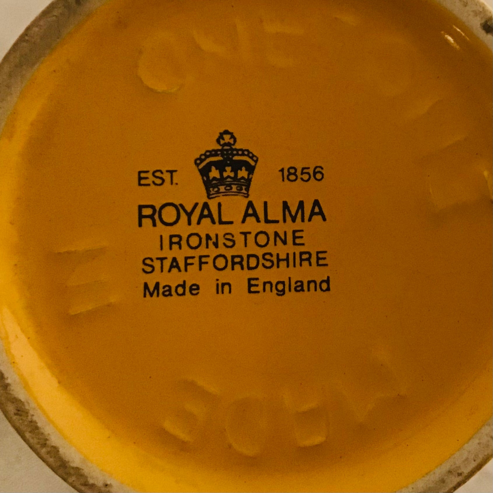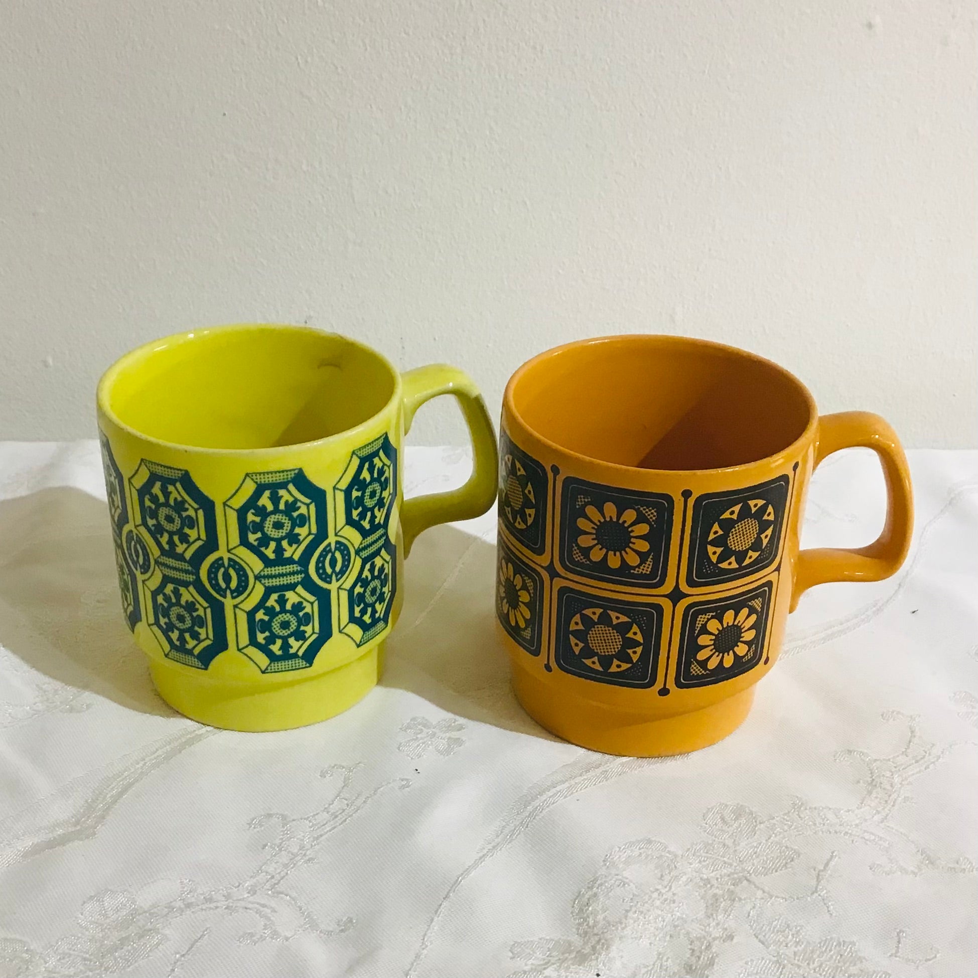Two coffee mugs made by Royal Alma, Staffordshire, England. Ironstone. Both feature groovy, flower power designs. Chartreuse cup has a small chip as seen in photo. Being sold separately.