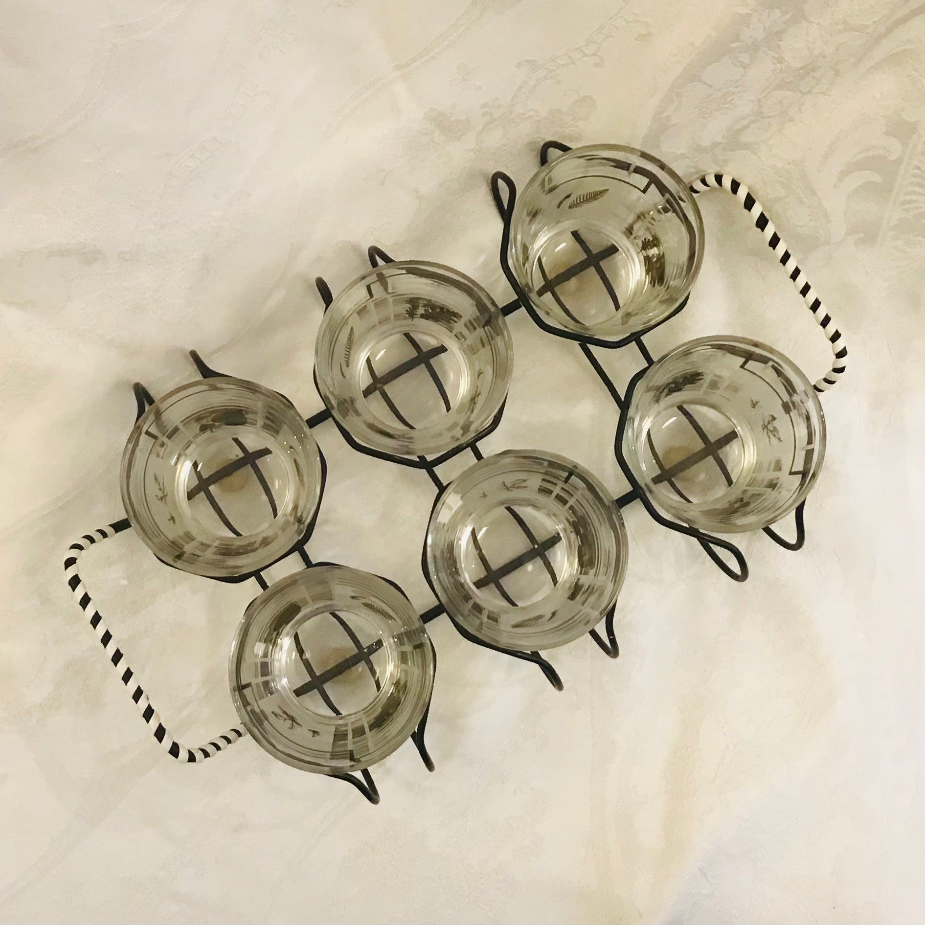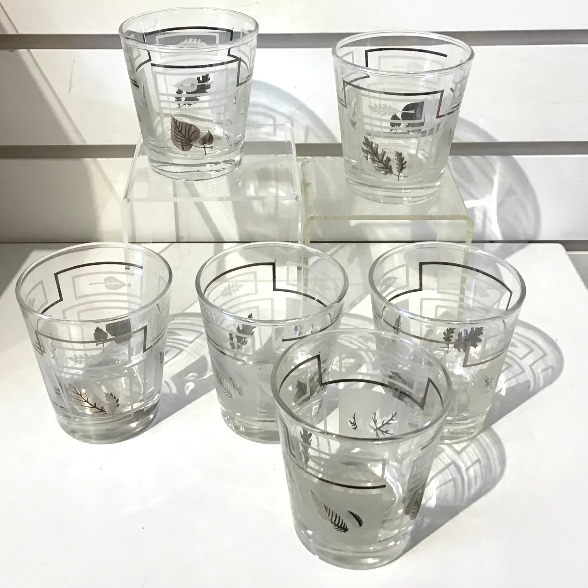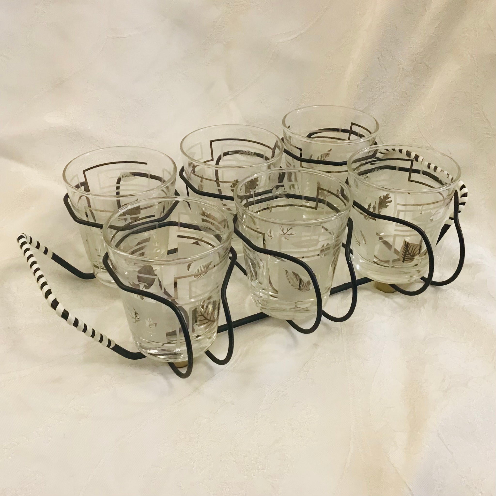 Set of six rocks glasses and caddy. Glasses feature a silver leaf pattern with frosted details and caddy has wrapped handles. Glasses made by Dominion Glass.