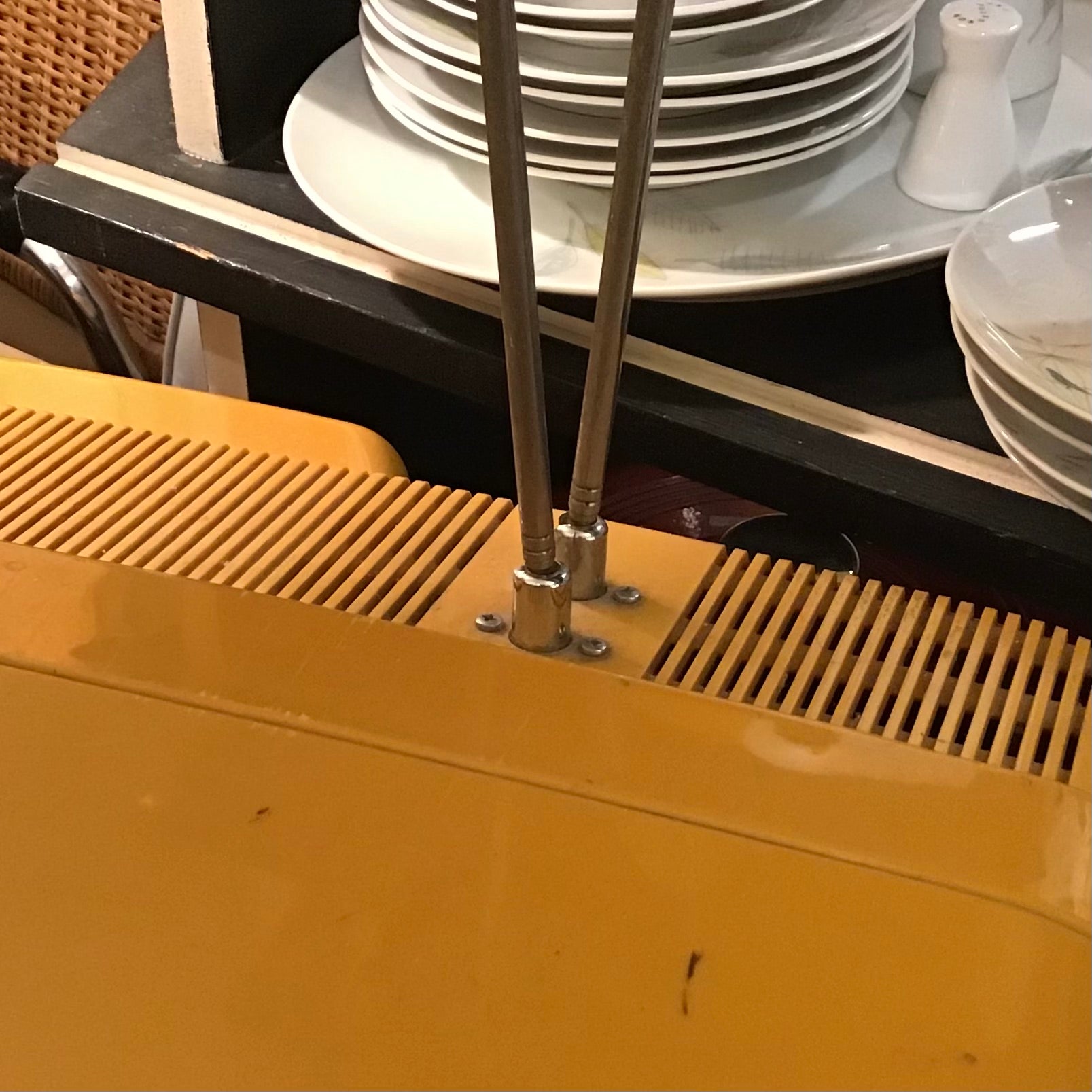Vintage, 1977 Toshiba Blackstripe C385C television with pedestal. Mustard colour casing. Good working condition but on/off button is broken off, so you need pliers to turn it on and off. Made in Tokyo, Japan.
