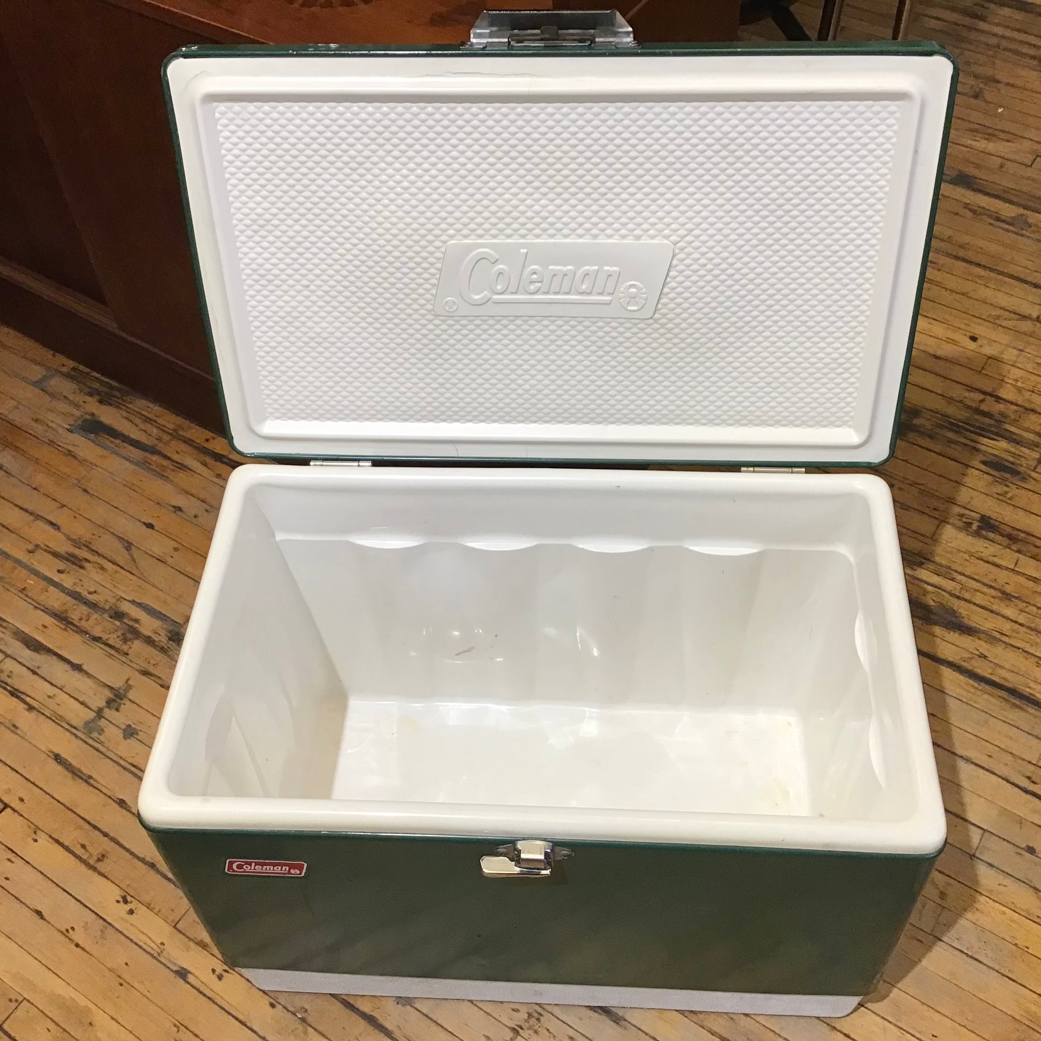 Vintage 1970s Coleman Cooler. Green painted metal with plastic interior. Measures 22 1/2” long by 13 1/2” wide by 16” tall.