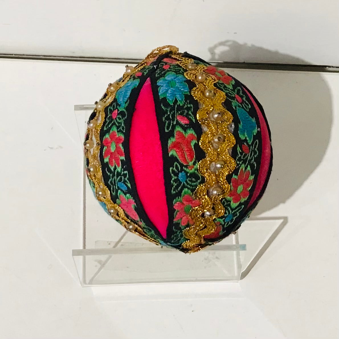 Vintage hand embellished Christmas ornaments, using velvet, brocade and gold rickrack.