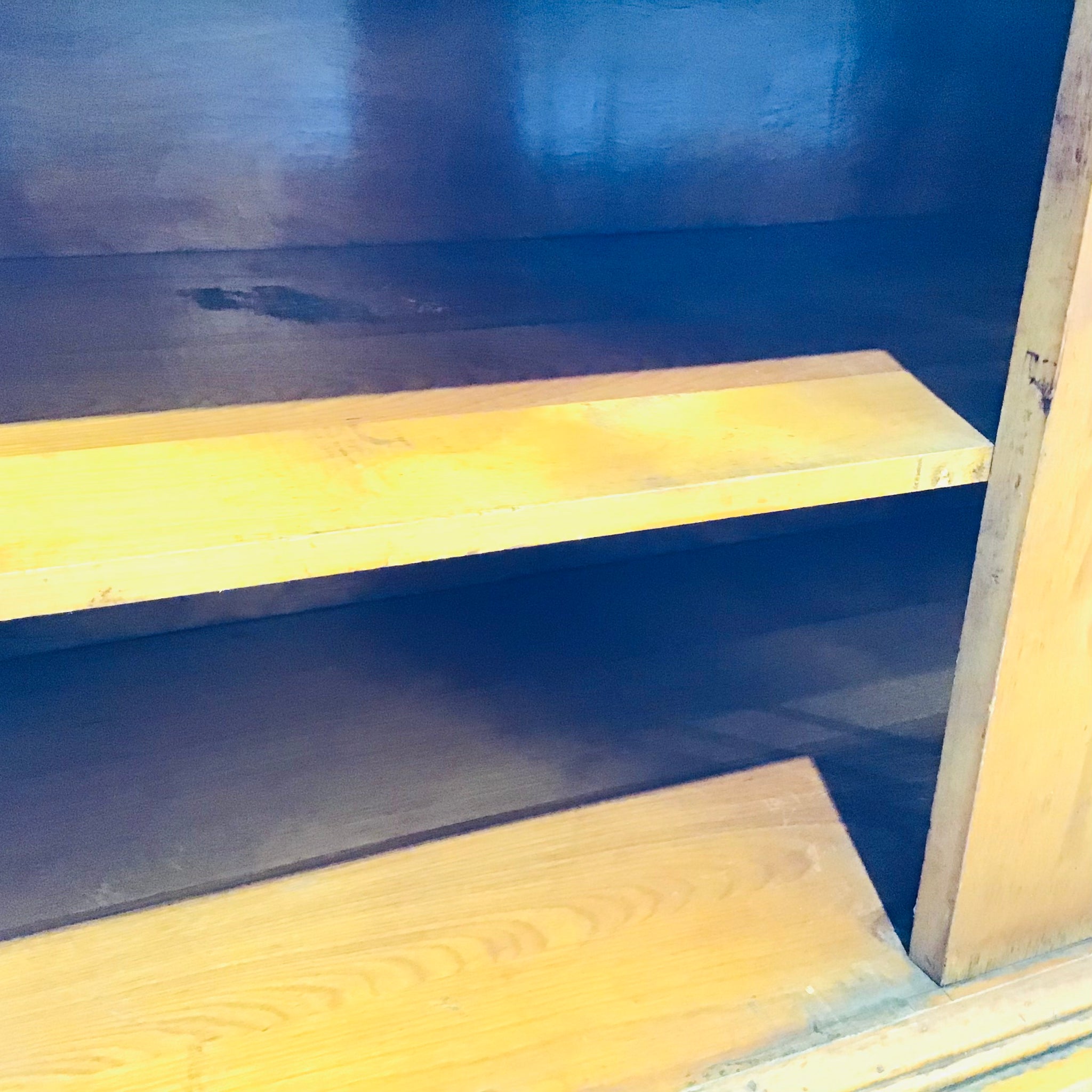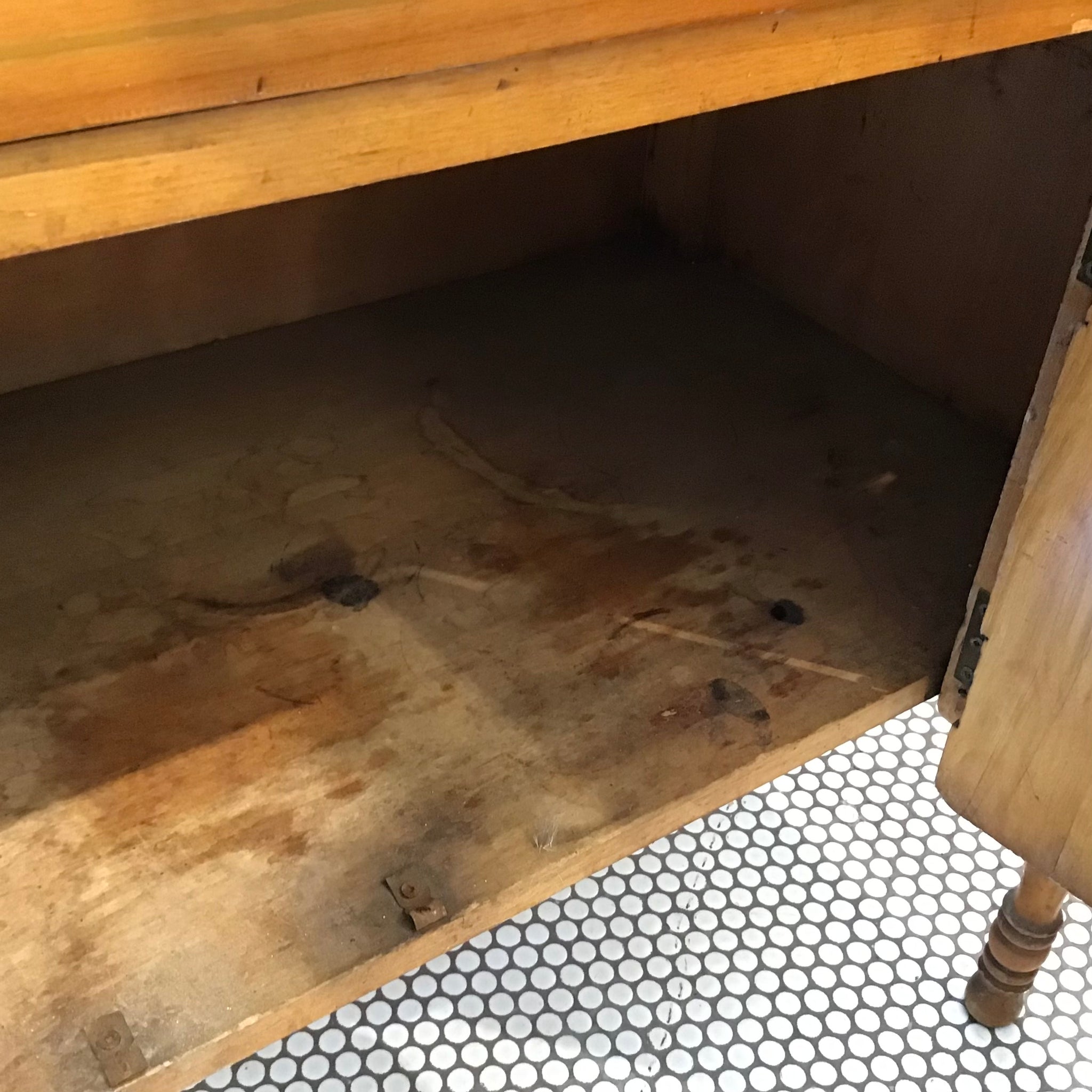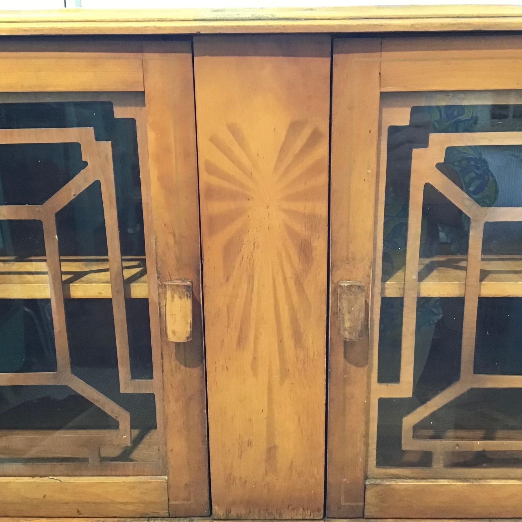 Vintage 1940s cabinet with display hutch. looks like pine. Features decorative inlay and fretwork insert in glass door windows. Drawer and cabinet storage below. Very shabby chic.