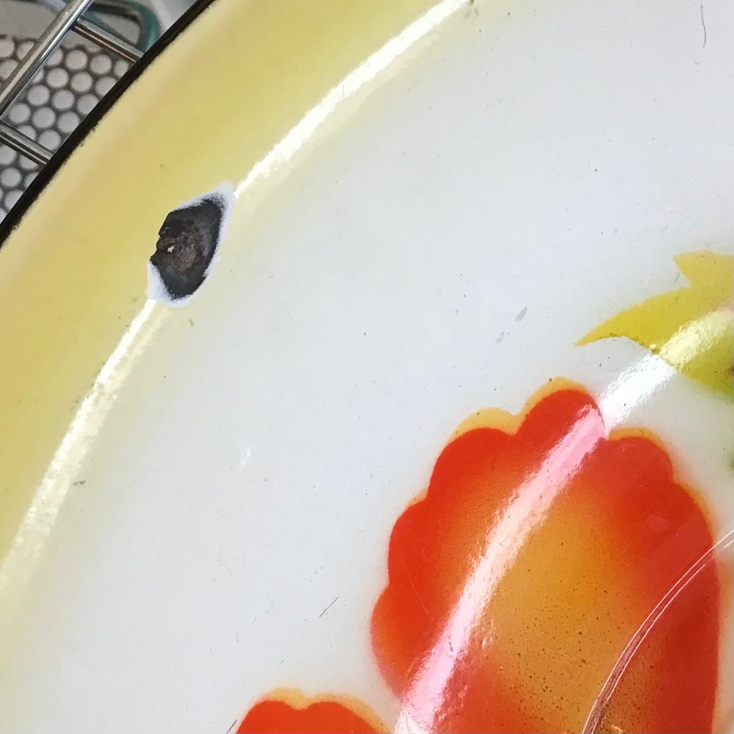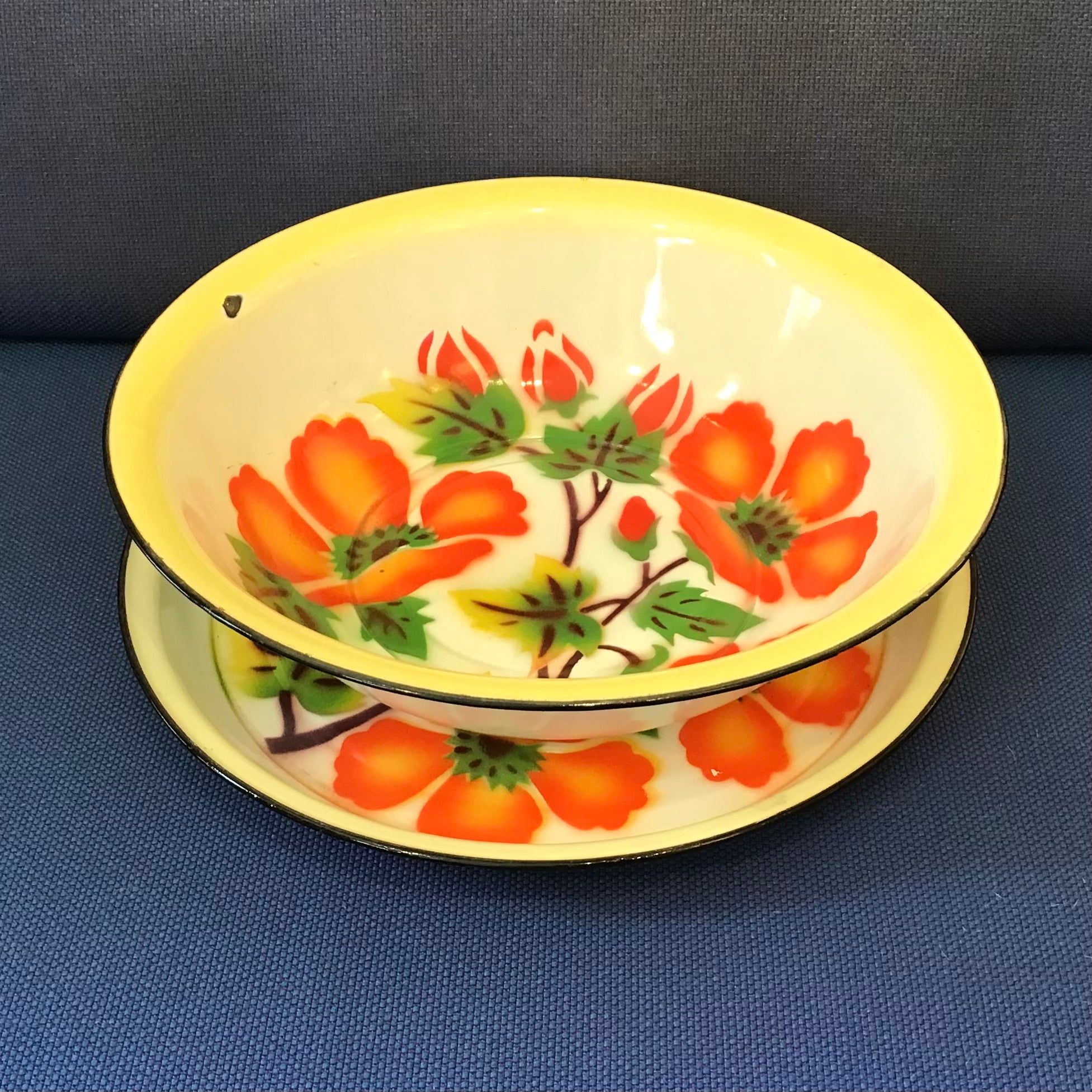 Vintage enamelware bowl & platter tray, featuring a vibrant handpainted airbrush style floral design in orange, yellow & green. Made in Thailand. Each piece sold separately.